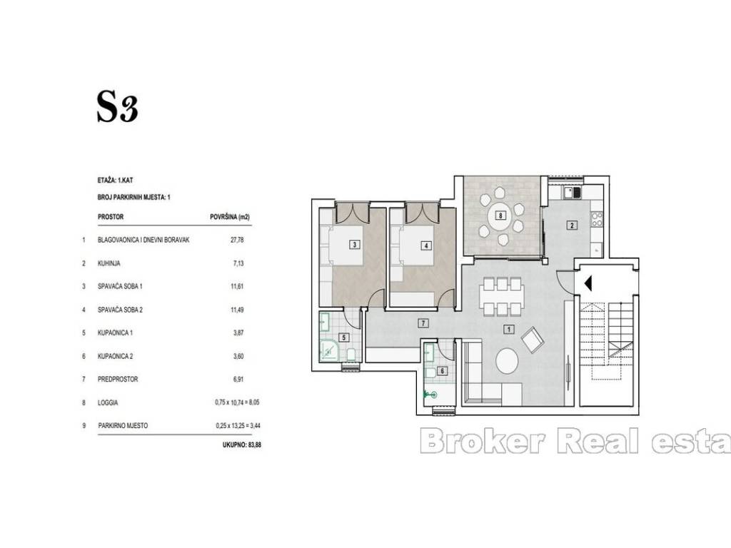 -Apartman S3, 1.Kat -84m2 Sastoji se od dnevnog boravka s blagovaonicom, kuhinje, 2 sobe, 2 kupatila, hodnika, lođe i parking mjesta.