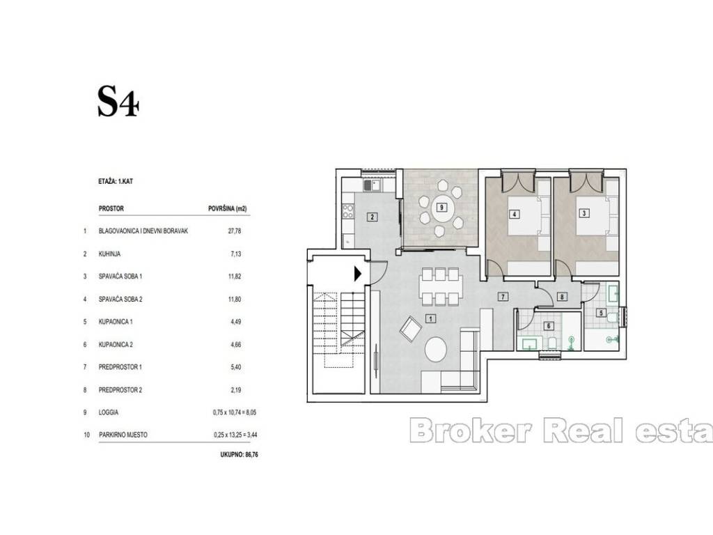 -Apartman S4, 1.Kat -87m2 Sastoji se od dnevnog boravka s blagovaonicom, kuhinje, 2 sobe, 2 kupatila, hodnika, lođe i parking mjesta.