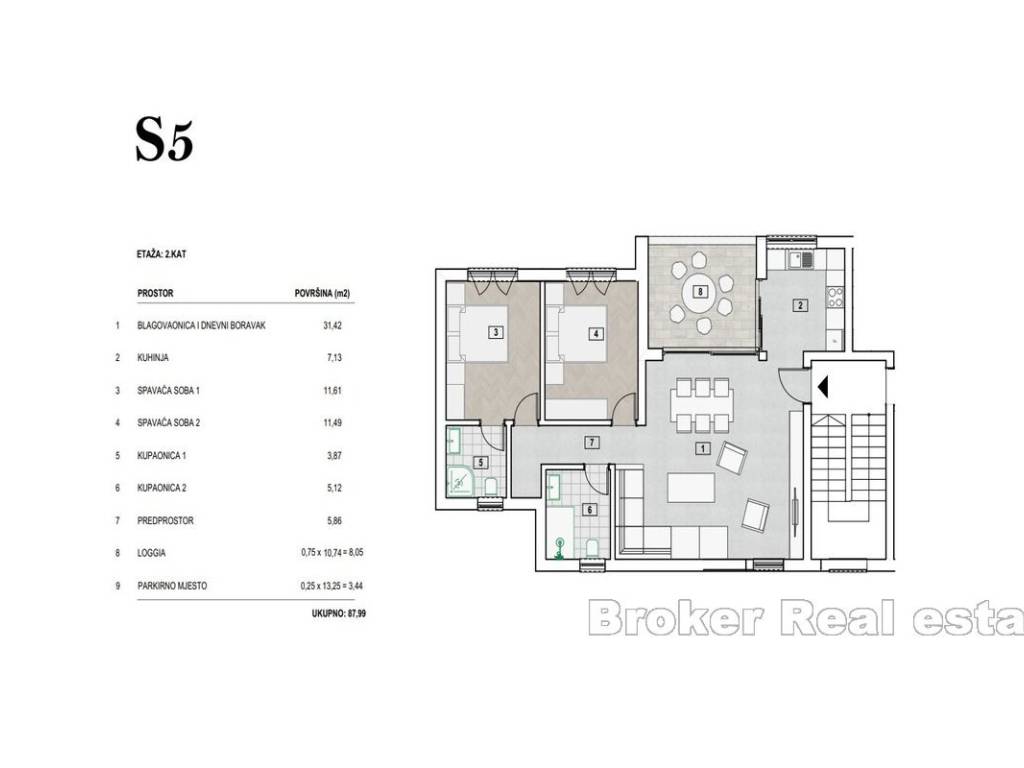 -Apartman S5, 2.Kat -88m2 Sastoji se od dnevnog boravka s blagovaonicom, kuhinje, 2 sobe, 2 kupatila, hodnika, lođe i parking mjesta.