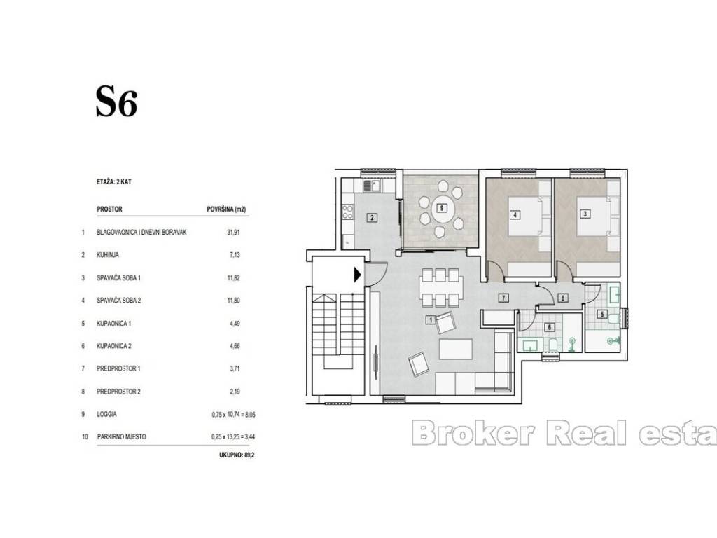 -Apartman S6. 2.Kat- 89m2 Sastoji se od dnevnog boravka s blagovaonicom, kuhinje, 2 sobe, 2 kupatila, hodnika, lođe i parking mjesta.