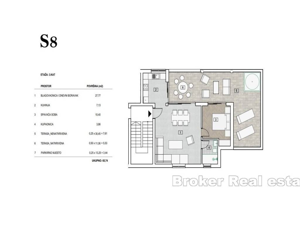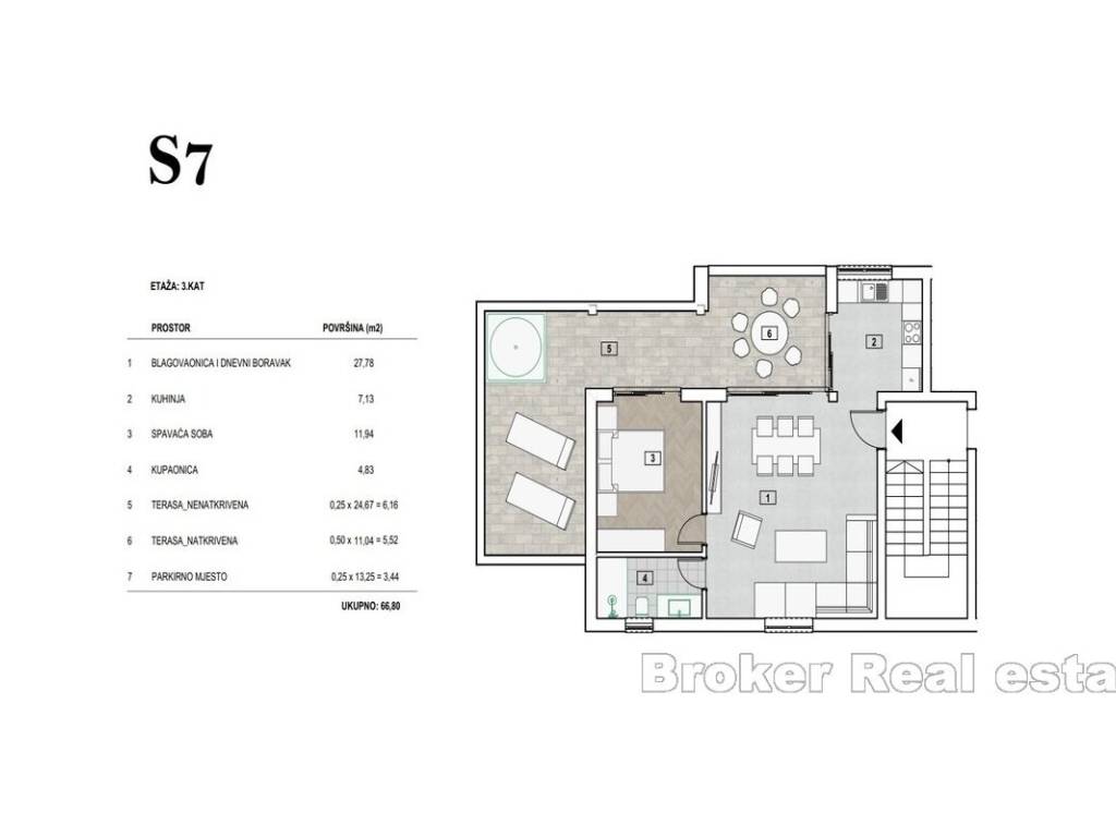 -Apartman S7. Penhouse -67m2 Sastoji se od dnevnog boravka s blagovaonicom, kuhinje, sobe, kupatila, 2 terasa i parking mjesta.