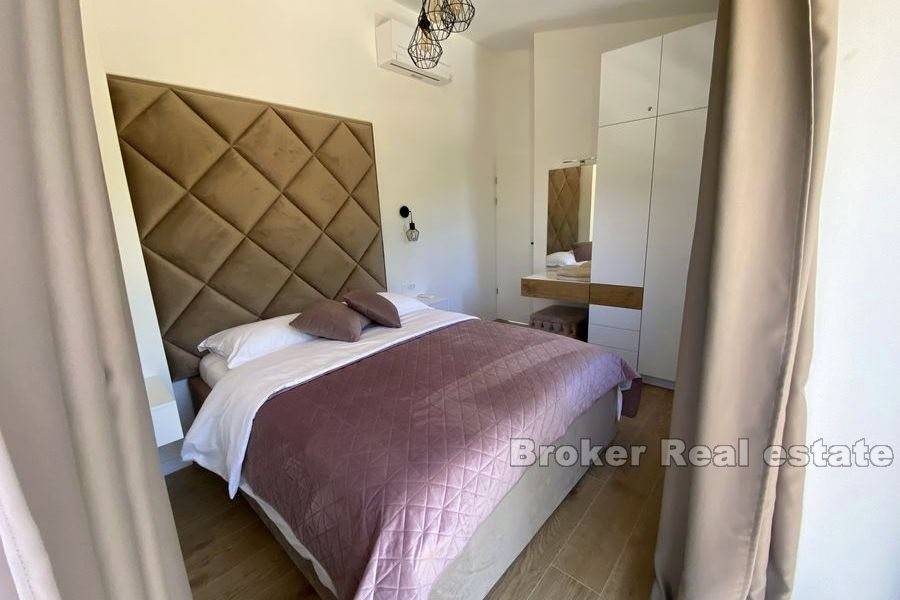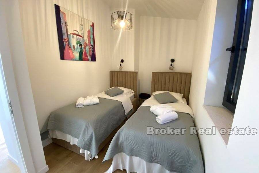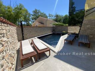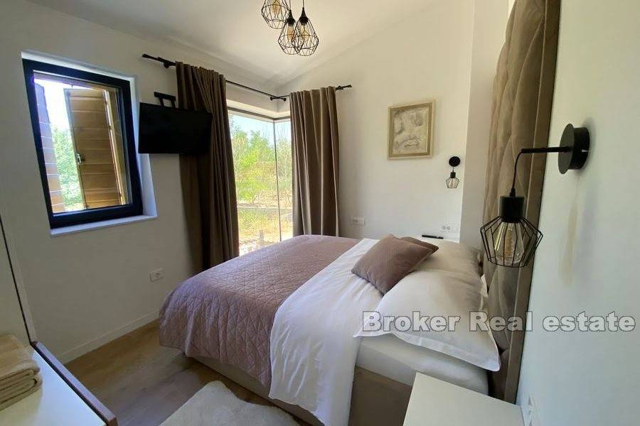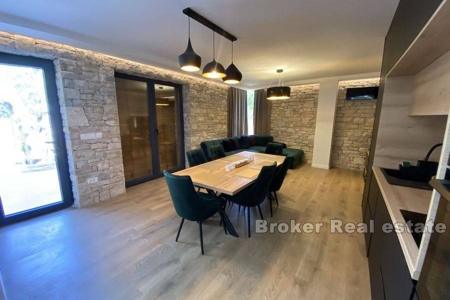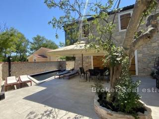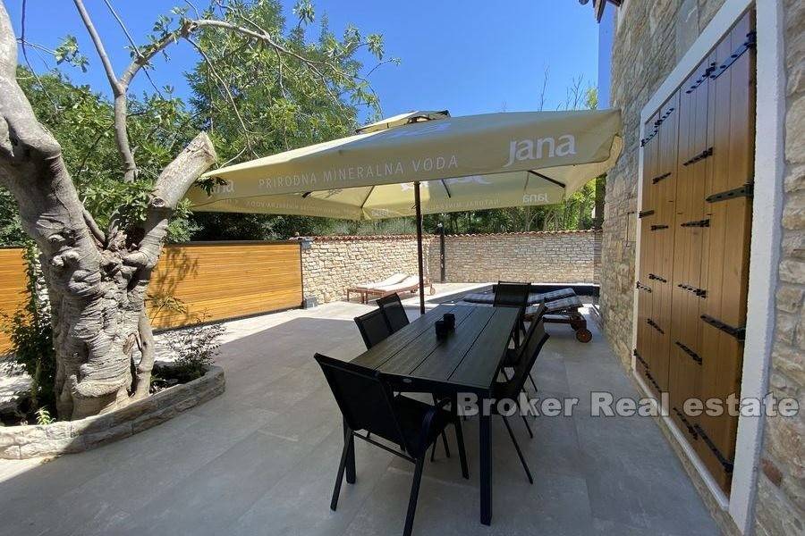 Predivna kamena kuća u novogradnji u blizini Zadra. Jedinstvena i uistinu zanimljiva kuća smještena na parceli od 158m2 sa bazenom i vlastitim parkingom. Smjestila se na području koje odiše mirnoćom i privatnošću dok su ujedno svi bitni sadržaji u neposrednoj blizini. Nekretnina je građena od renomiranih materijala poput kamena sa vojarne iz 1905. godine koje je kombinirano sa reflektirajućim staklom koje sakriva unutrašnjost. Pri uređenju interijera i eksterijera kuće korišteni su materijali iznimne kakvoće. Vrata i prozori napravljeni su od Sibirskog bora, za okvir vrata koristio se pravi bijeli kamen koji je pomogao pri izolaciji i debljini zida od 54cm, dok se puni hrast iskoristio za unutarnje stubište. Kuća ukupne stambene površine 102m2 sastoji se od kuhinje, blagovaonice, dvije spavaće sobe i dvije kupaonice. Nekretnina je opremljena strojnim podnim grijanjem uz dodatna 3 klima uređaja. Kući pripada bazen od 23m2 sa tamnom podlogom za dodatan efekt i dizalicom topline koja se može regulirati. S ovom uistinu zanimljivom nekretninom dobiti ćete potpuni osjećaj doma ne samo uz savršenu kombinaciju modernog i autohtonog, već i uz okolinu i prirodu koja je okružuje. Centar mjesta i more nalaze se na udaljenosti od 400 metara od kuće dok je Zadar udaljen manje od 20 kilometara i zračna luka 30 kilometara.