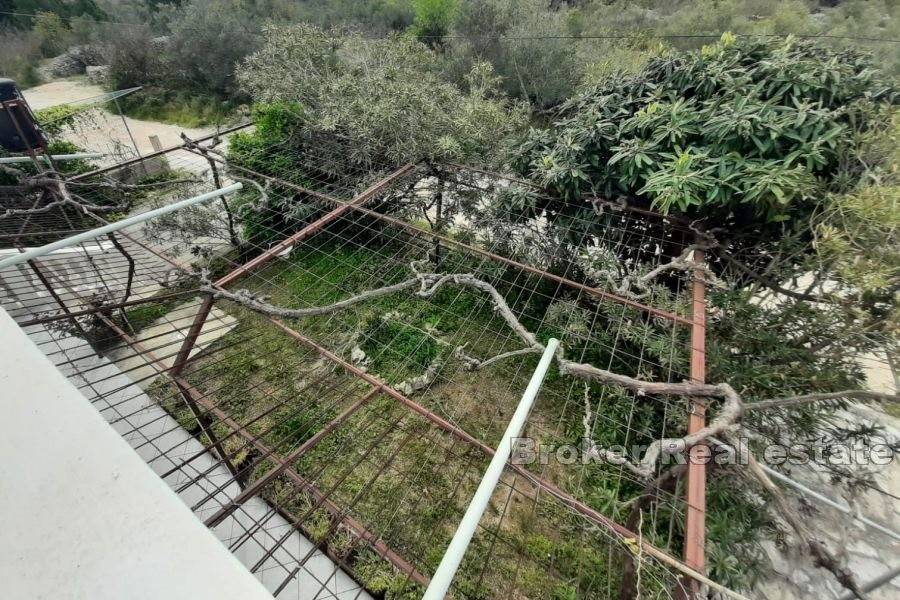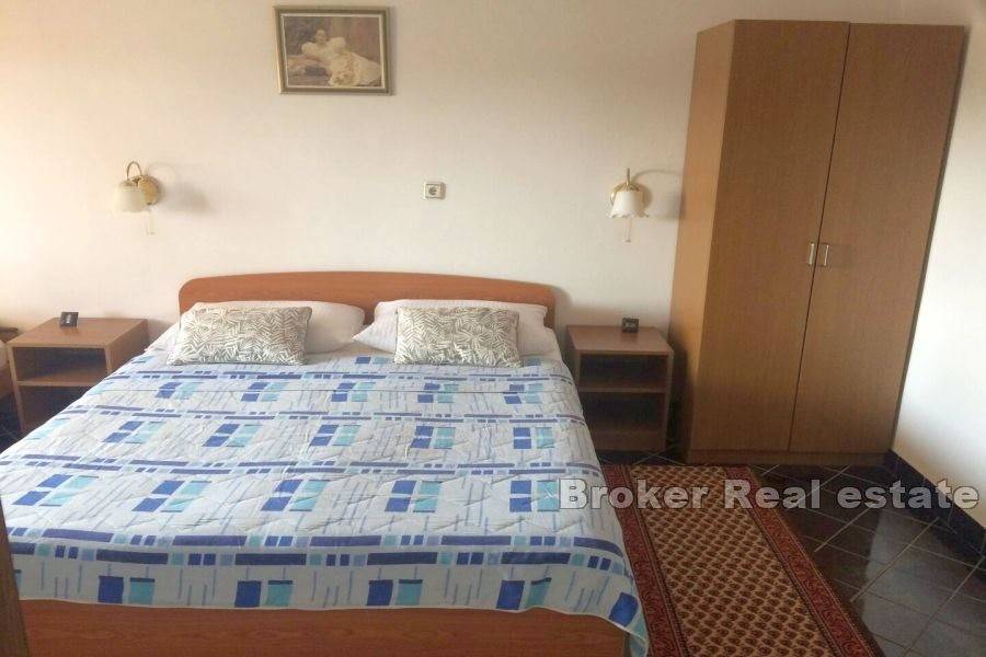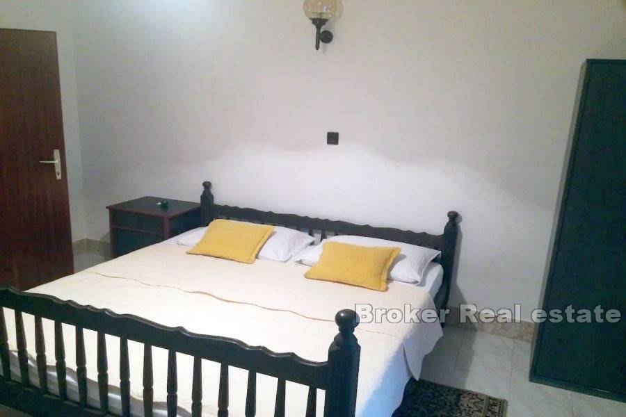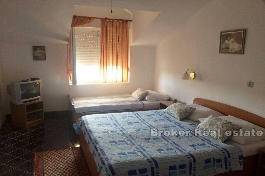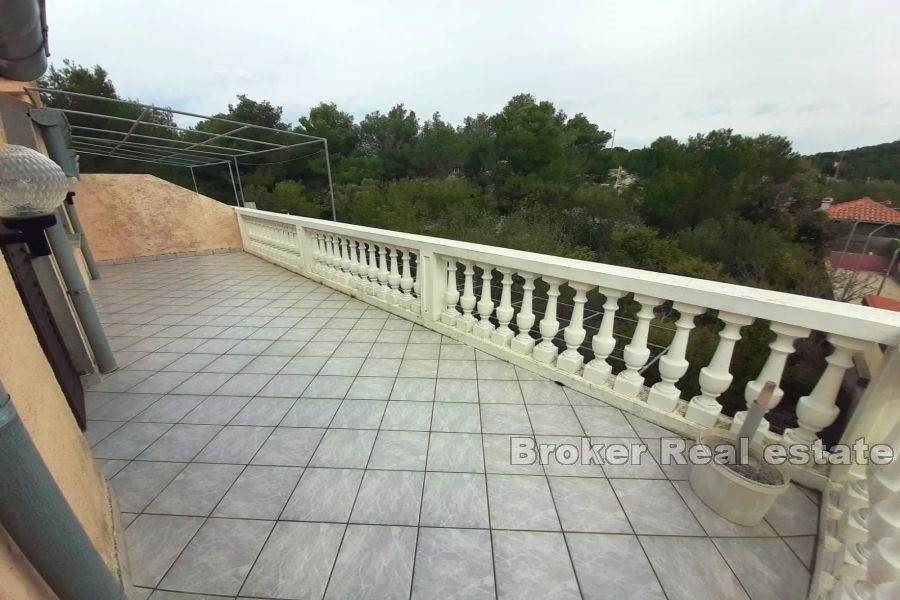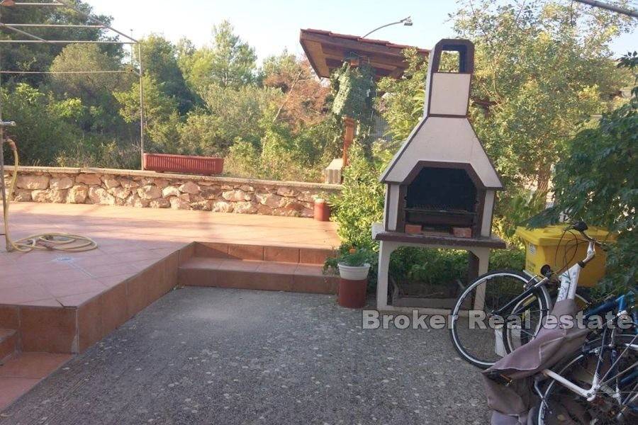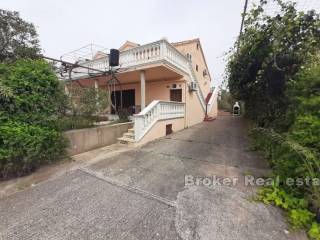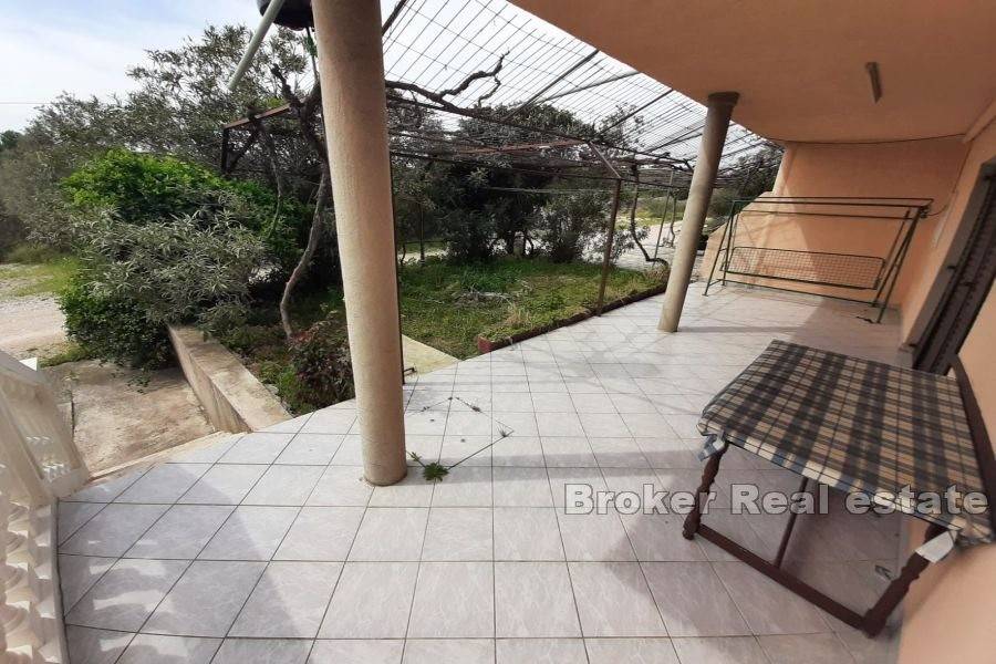 Dvojna apartmanska kuća ukupne stambene površine 166 m2, izgrađena na zemljištu površine 341 m2. Smještena u malom mjestu pored Murtera. Sastoji se od 2 etaže. Na etaži prizemlja nalazi se apartman koji se sastoji od jedne spavaće sobe, kupaonice,kuhinje te dnevnog boravka. Na istoj etaži se nalaze još dva studio apartmana sa izlazima na terasu. Na etaži prvog kata nalaze se dva jednosobna apartmana. Svaki apartman se sastoji od jedne spavaće sobe, kupaonice, te male kuhinje I blagovaone. Svaki apartman ima izlaz na terasu. Kuća je u turističkom najmu. Dostupan je parking na prostranoj okućnici a kuća posjeduje I garažu koja se nalazi ispred kuće. Kuća je smještena na lijepoj lokaciji, nalazi se u mirnom mjestu 6 km od Murtera, te 2 km od mjesta Tisno. Najbliža šljunčana plaža je udaljena 700 m. Plaža je plitka i prigodna za djecu. Svi ostali sadržaji koji su esencijalni za život nalaze se u susjedstvu.