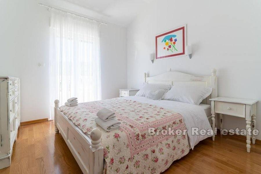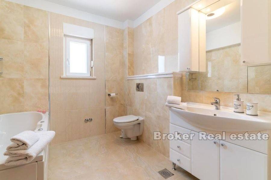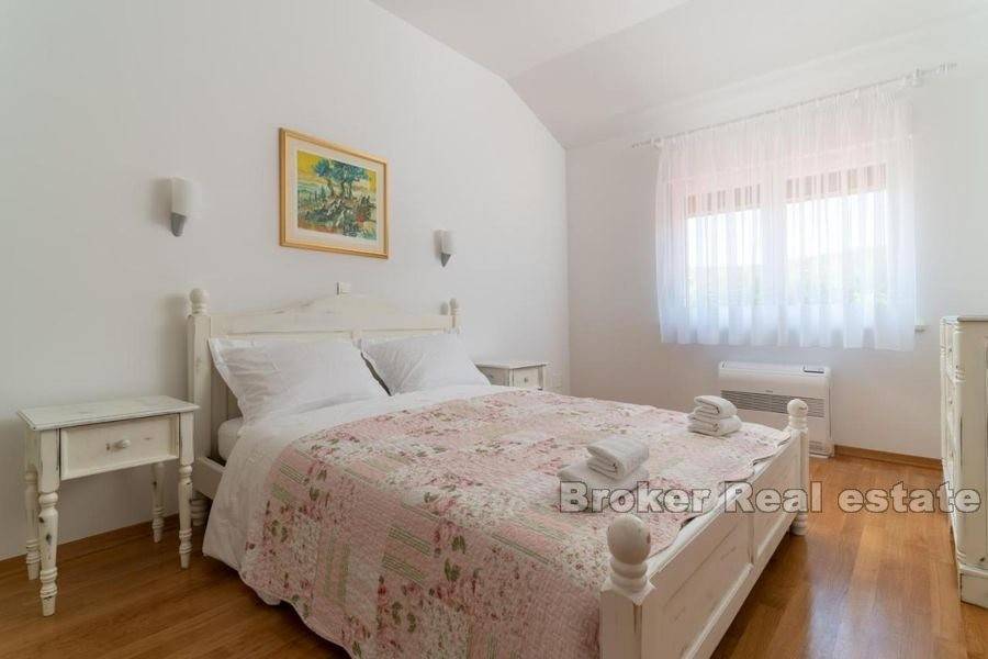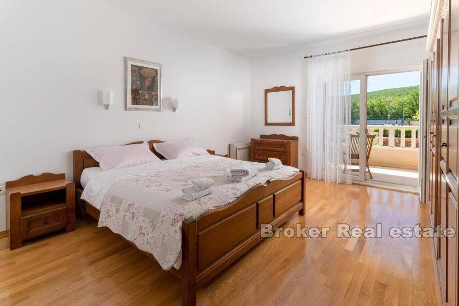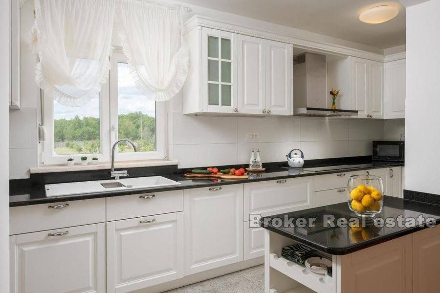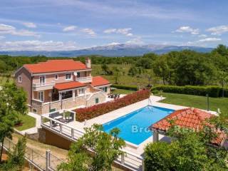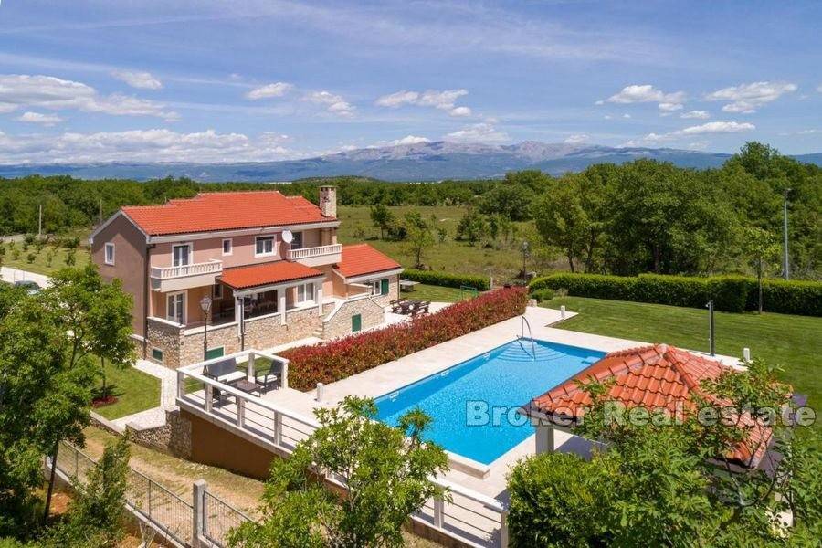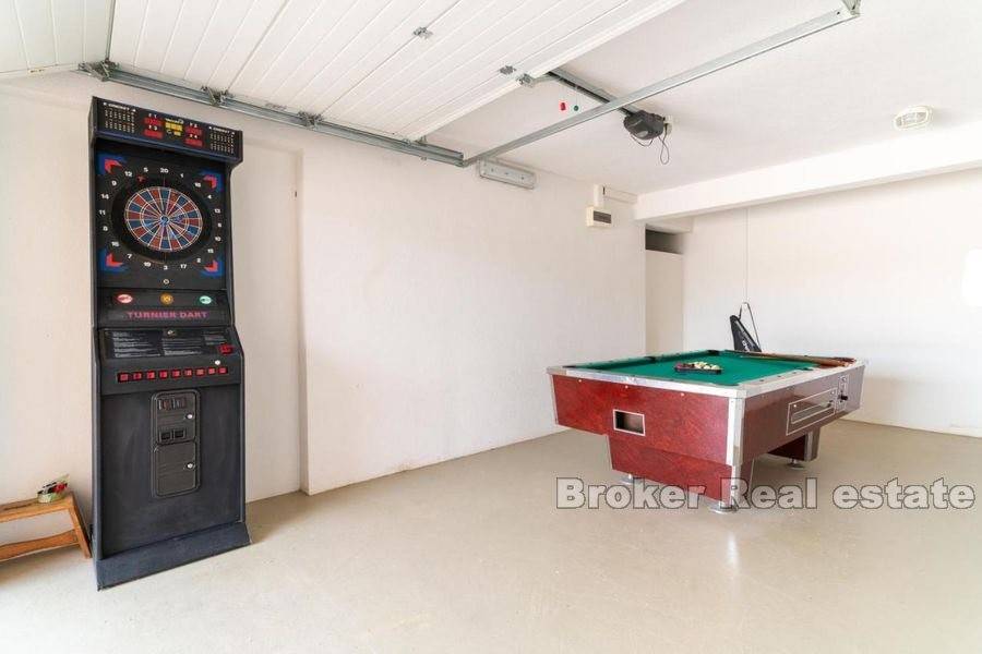 Prekrasno imanje na mirnoj lokaciji. Nekretnina stambene površine od 400 m2 položena je na zemljištu od 11 000 m2. Kuća je rasprostranjena na tri etaže. U podrumu se nalaze garažna mjesta i skladišni prostor. Prizemlje se sastoji od potpuno opremljene kuhinje, velikog dnevnog boravka, kupaonice i sobe te velike konobe sa kaminom. Na katu se nalaze četiri velike sobe od kojih tri dijele vlastitu kupaonicu dok četvrta soba ima vlastitu kupaonicu. Ispred kuće se nalazi velika terasa za druženje te vanjski roštilj. Od ulaza na imanje do kuće vodi kamenom popločana šetnica okružena travnjakom i voćkama. Iza kuće nalazi se veliki, grijani bazen i pomoćni objekt koji je podijeljen na studio apartman i veliku kuhinju. Još jedan pomoćni objekt ima funkciju konobe u kojoj se odlaže vino i hrana te je predviđena za druženje velikog broja ljudi. Iza konobe nalazi se i teniski teren. Smješteno na nevjerojatnoj, ruralnoj lokaciji ovo imanje vlasnicima pruža mir i privatnost ali je u isto vrijeme u blizini svih sadržaja potrebnih za život. Udaljenost Splita je 20 minuta vožnje a od zračne luke Split je 29km.
