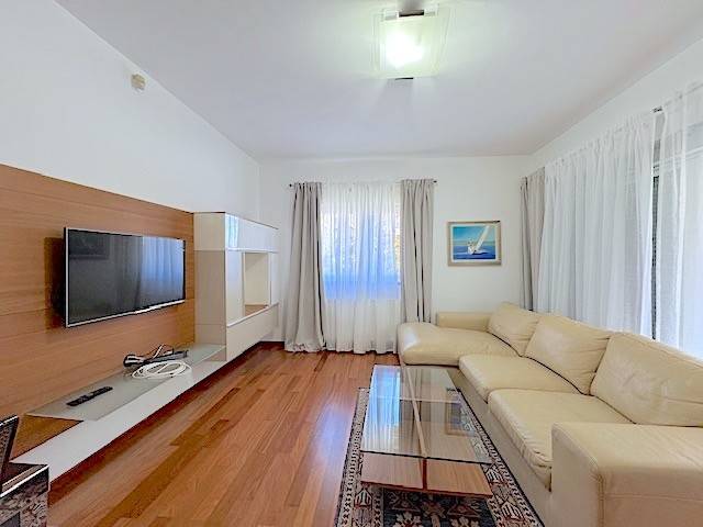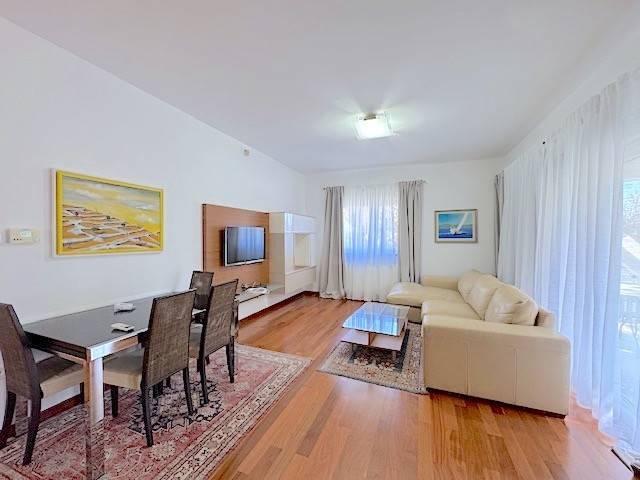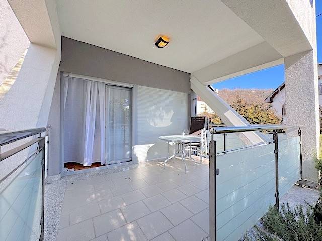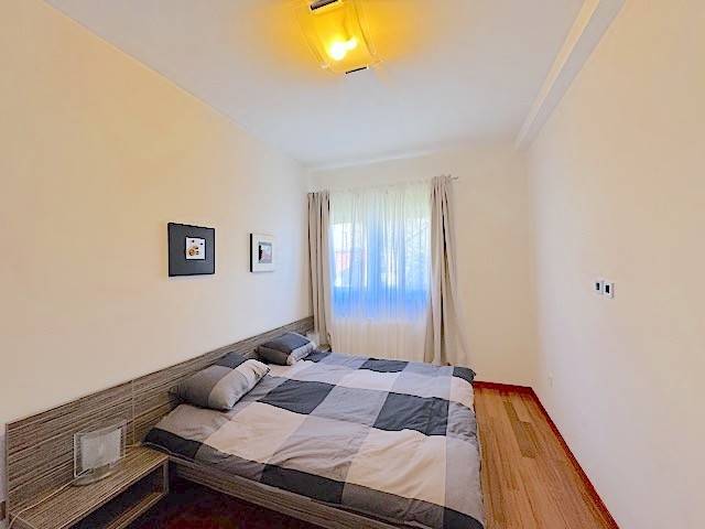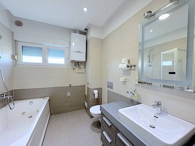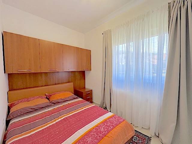 Stan se nalazi u prizemlju novije zgrade a, sastoji se od dnevnog boravka s kuhinjom i blagovanjem i izlazom na lođu (10m2) i vrt (120m2), 2 spavaće sobe, kupaonice. Potpuno je namješten i ima parkirno mjesto u dvorištu zgrade ( 10 m2 ). Mogućnost korištenja teretane, saune i hidromasažne kade u zgradi udaljenoj samo 100-ak m od stana.