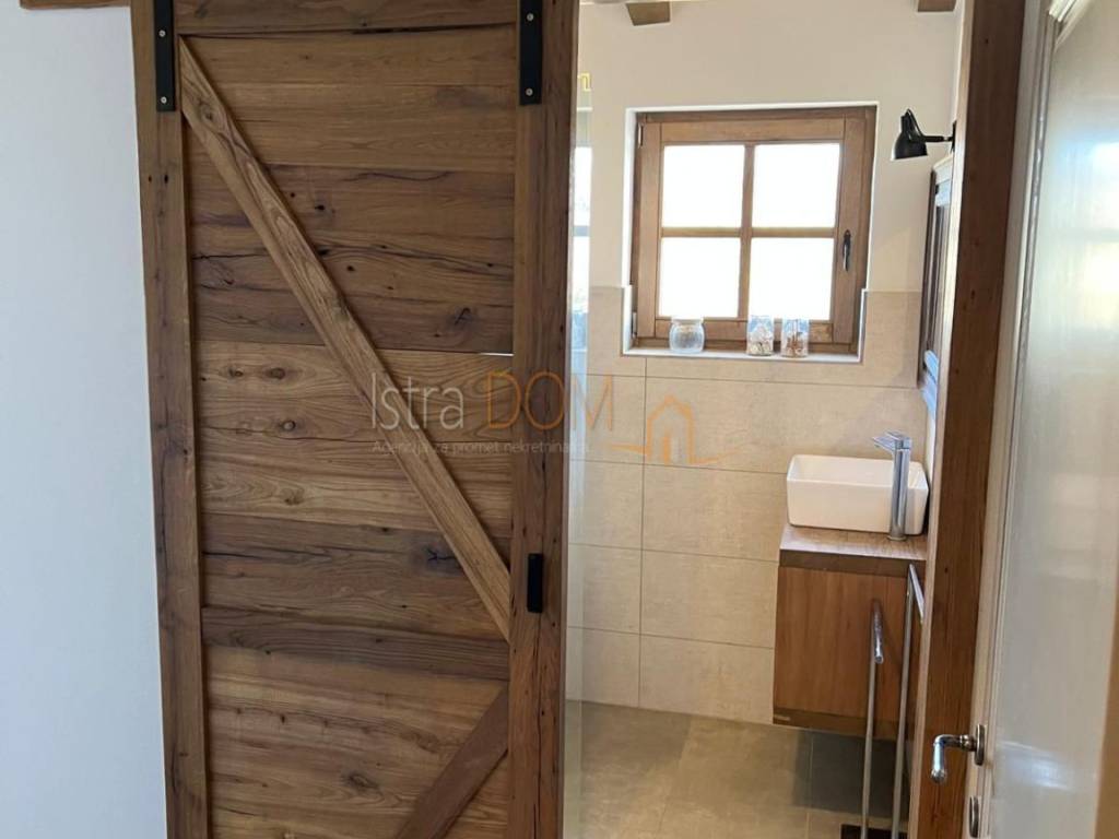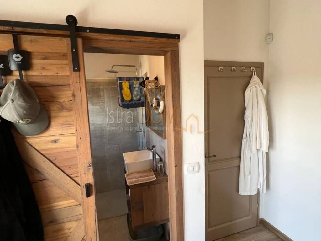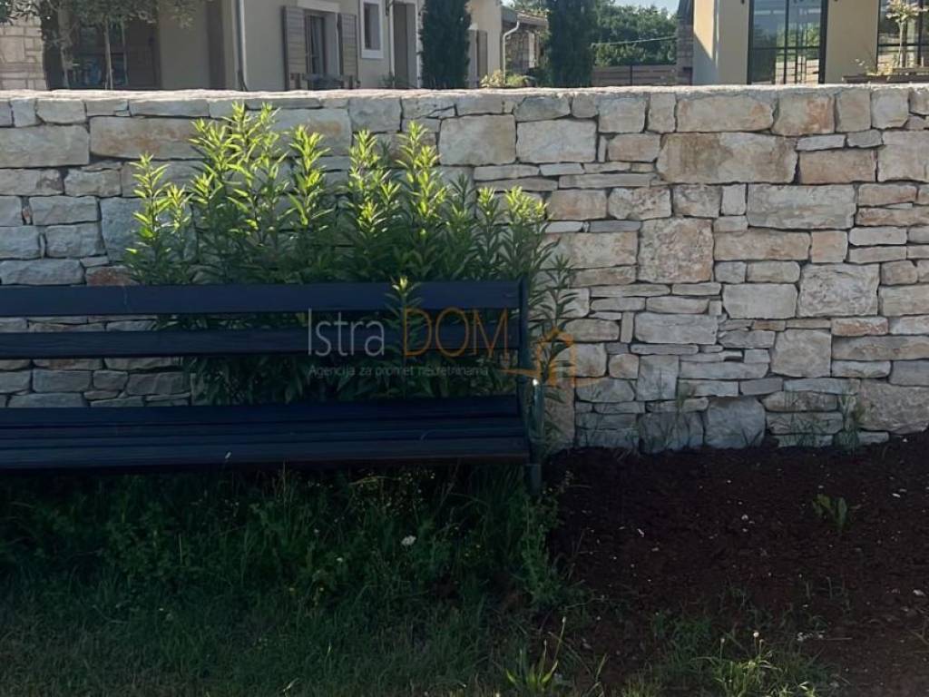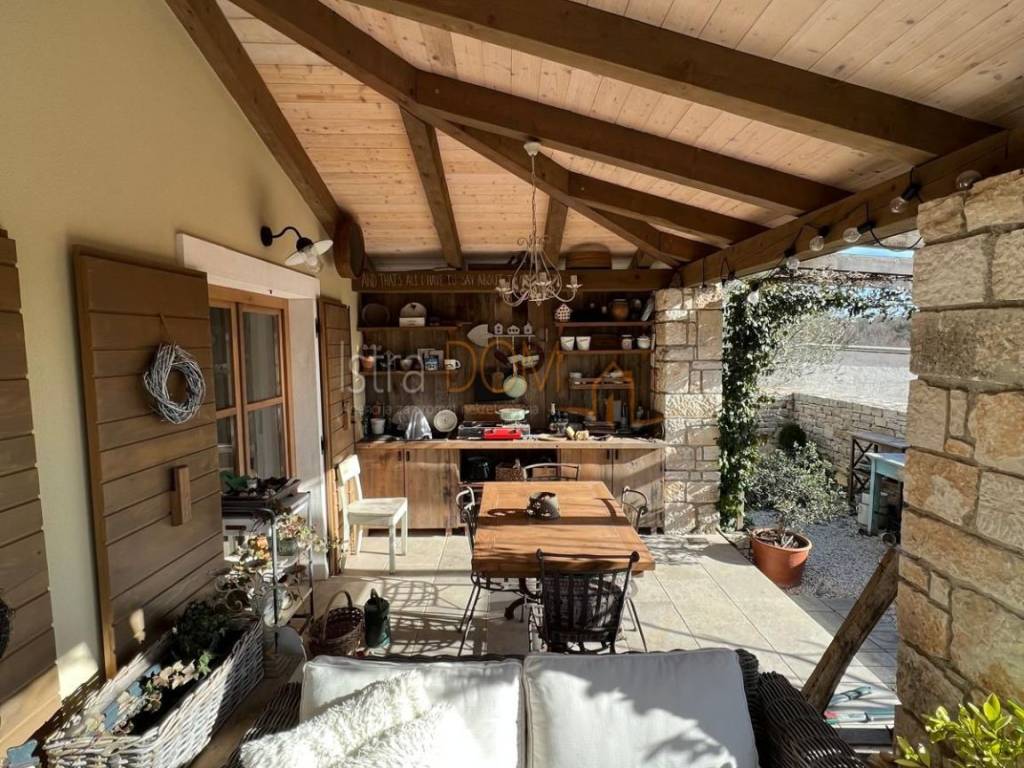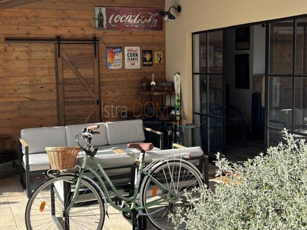 Okućnica je pažljivo uređena i okružena mediteranskim biljem, pružajući savršeno okruženje za opuštanje i uživanje u prirodi. Dodatno, uz kuću se nalazi pomoćni objekt od 23 m², opremljen kupaonicom i terasom, koji može poslužiti kao gostinjska soba ili prostor za rekreaciju.