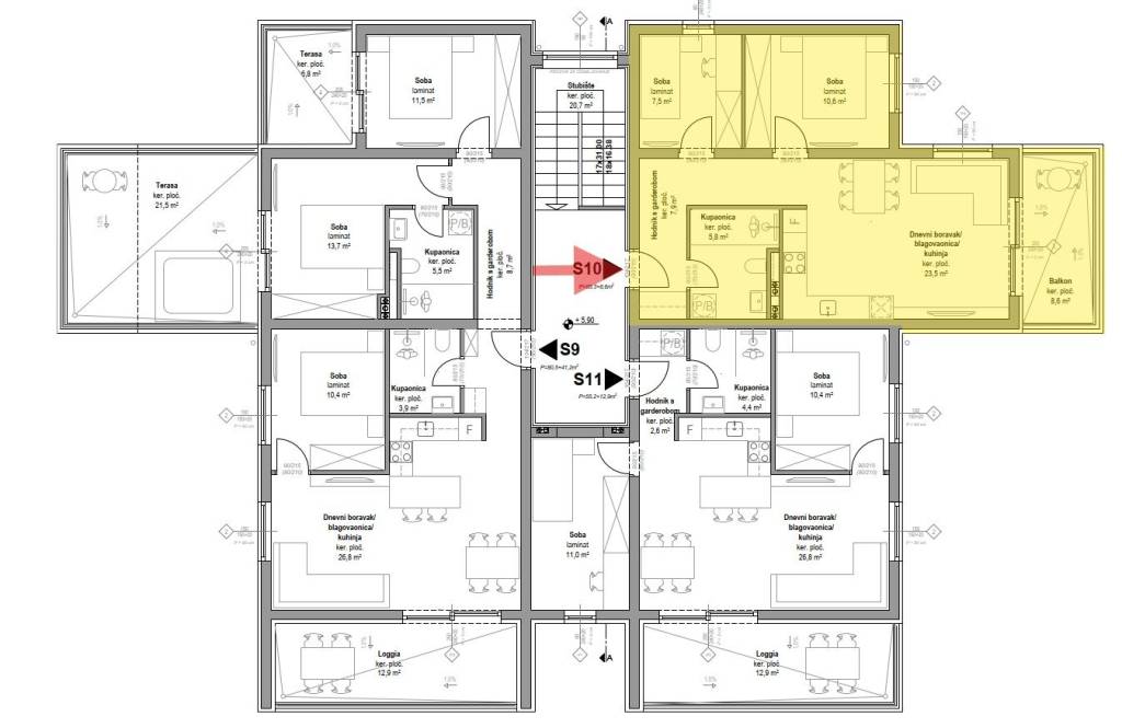 Stan S9- 104.77 m2 koji se sastoji od: dnevni boravak, kupaonica1, kupaonica 2, hodnik, soba 1, soba 2,soba 3, lođa, terasa 1, terasa 2, te dva parkirna mjesta u dvorištu zgrade = 293.000,00 €, PDV-e sastavni dio kupoprodajne cijene,