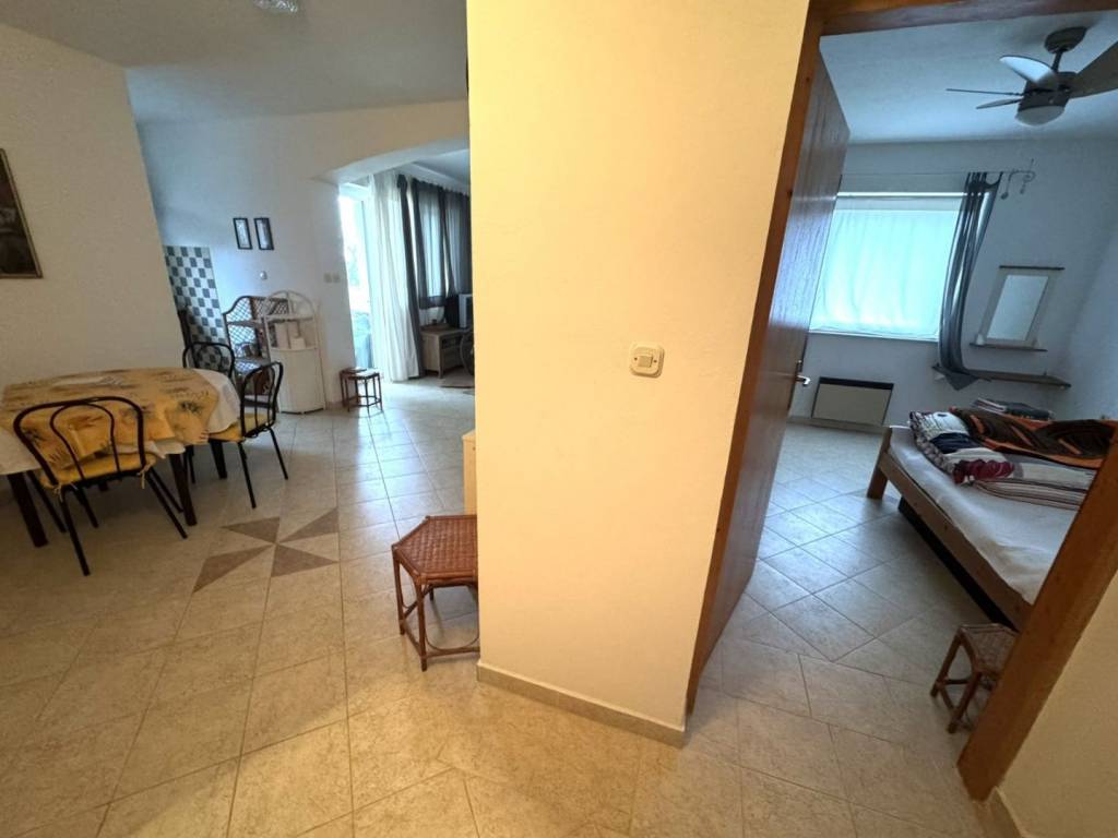 U ponudi imamo dvosoban stan u prizemlju površine 56,83 m2 s parkirnim mjestom uz stambenu zgradu u blizini mora svega 500 metara s teraso za opuštanje i i djelom okućnice u posjedu.