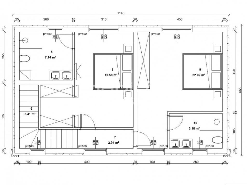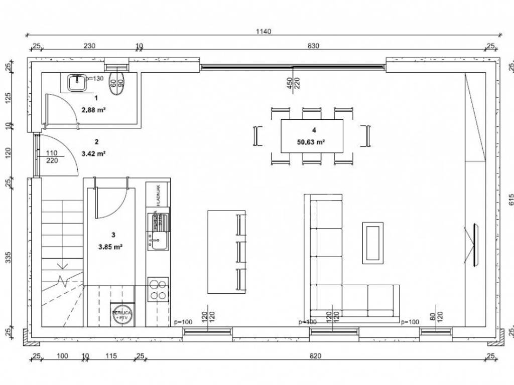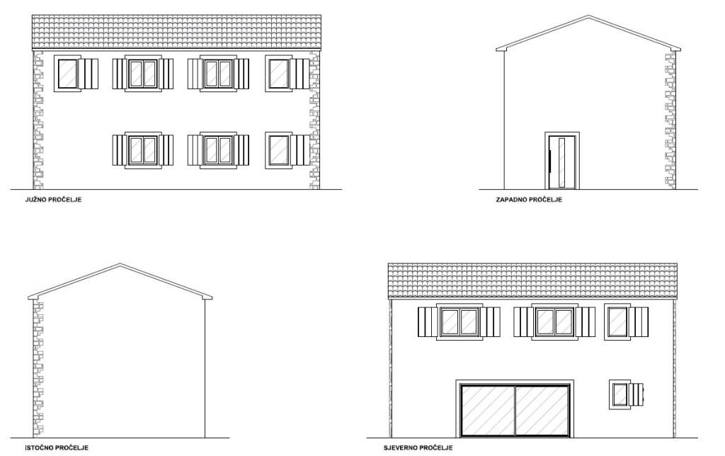 Samostojeća kamena kuća od 66 m2 tlocrtne površine, smještena na zemljištu od 650 m2. Trenutno se sastoji od prizemlja (dvije prostorije) i potkrovlja. Nekretnina ima idejni projekt prema kojem bi kuća imala 123 m2 na dvije etaže (prizemlje i kat). Projekt predviđa dvije spavaće sobe s kupaonicama na katu, dok bi u prizemlju bio 'open space' koncept s kuhinjom, blagovaonicom i dnevnim boravkom, uz gostinjski WC i spremište.