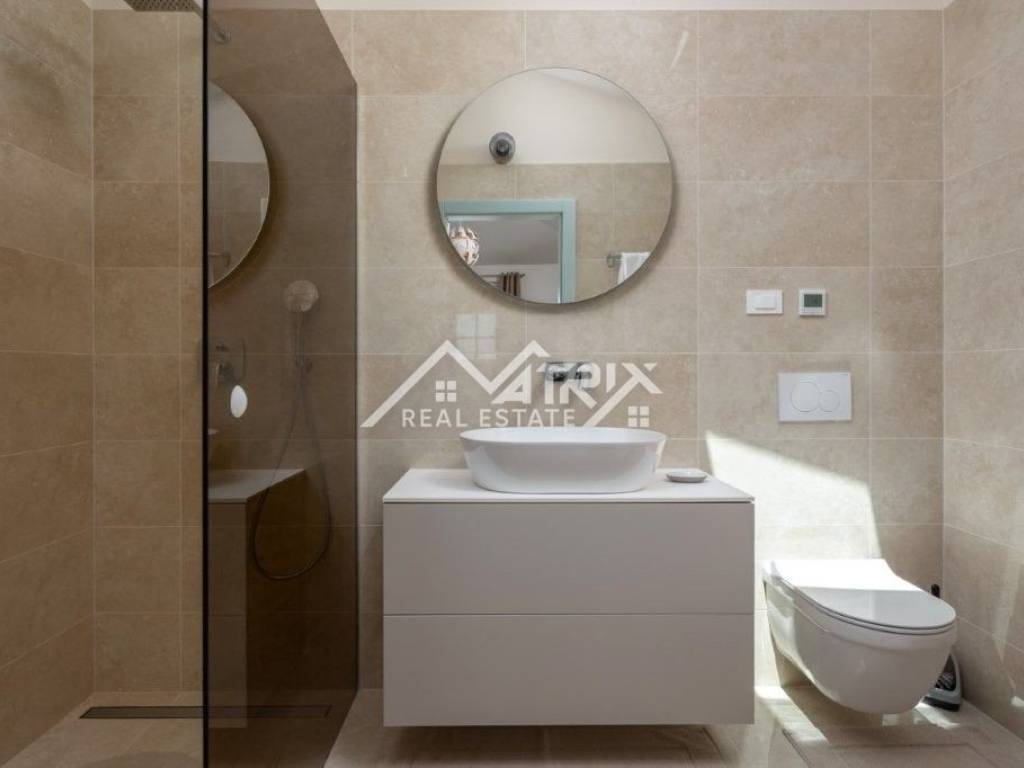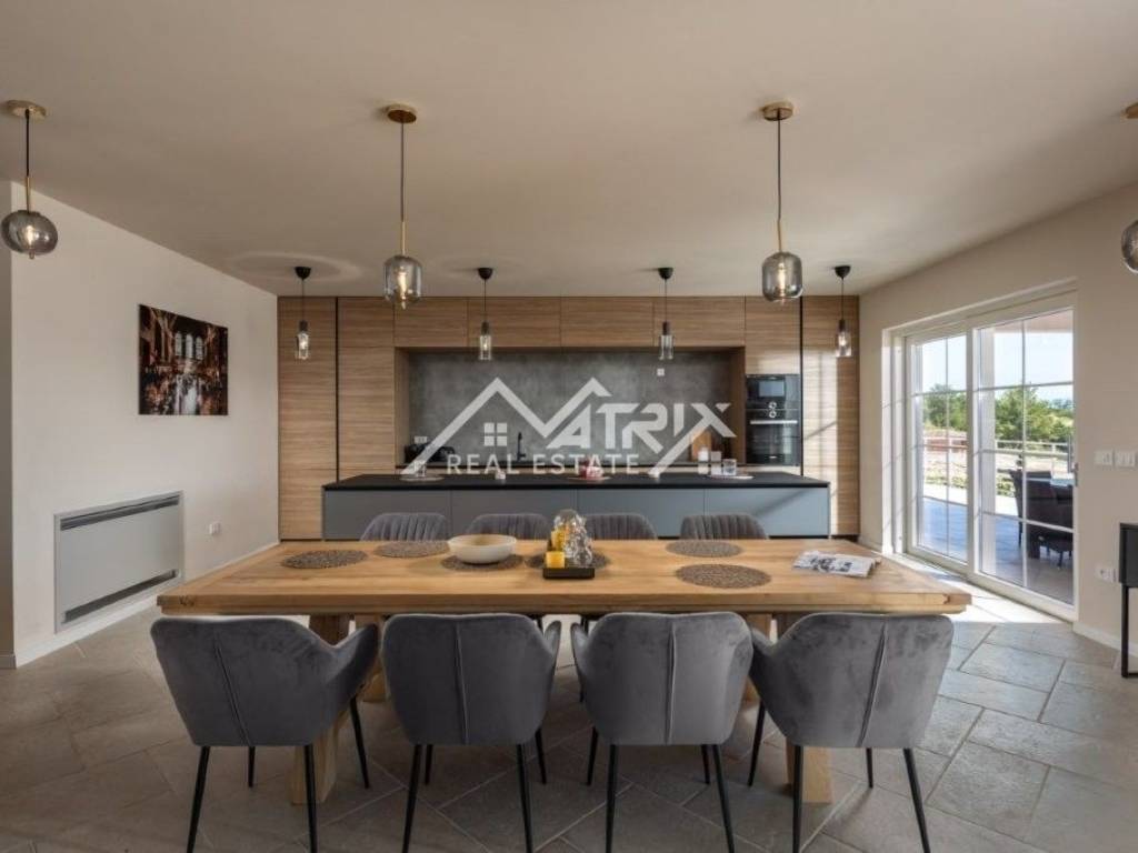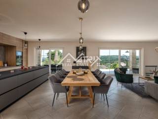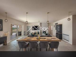 Arhitektura spaja suvremene linije i tradicionalne detalje, ali bez pretjerivanja. Prirodni kamen, keramika velikog formata i topli neutralni tonovi stvaraju prostor koji djeluje smireno, sofisticirano i trajno. Ovo nije kuća koja prati trend – ovo je kuća koja traje.