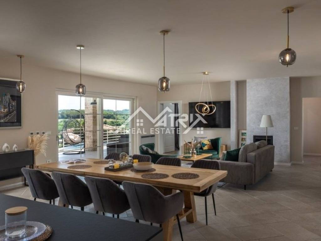 Dnevni boravak s kaminom prirodno se nastavlja na terasu i bazen, stvarajući savršenu povezanost interijera i eksterijera. Vanjski natkriveni prostor za blagovanje postaje produžetak dnevnog prostora – idealan za duga ljetna večernja druženja.