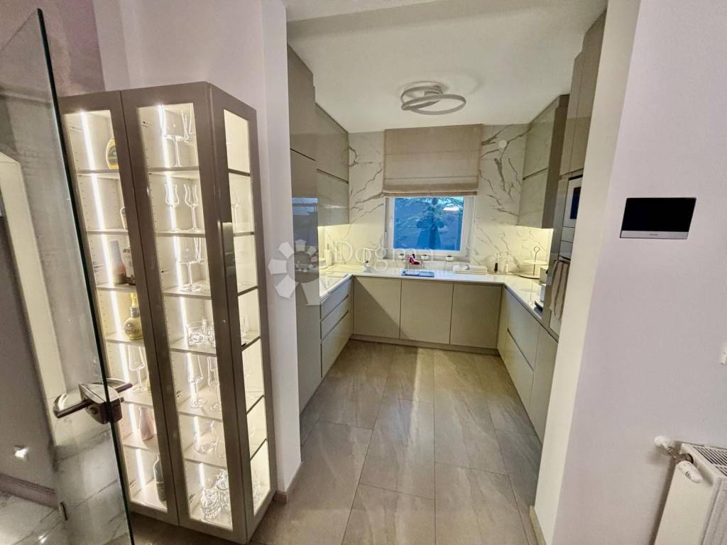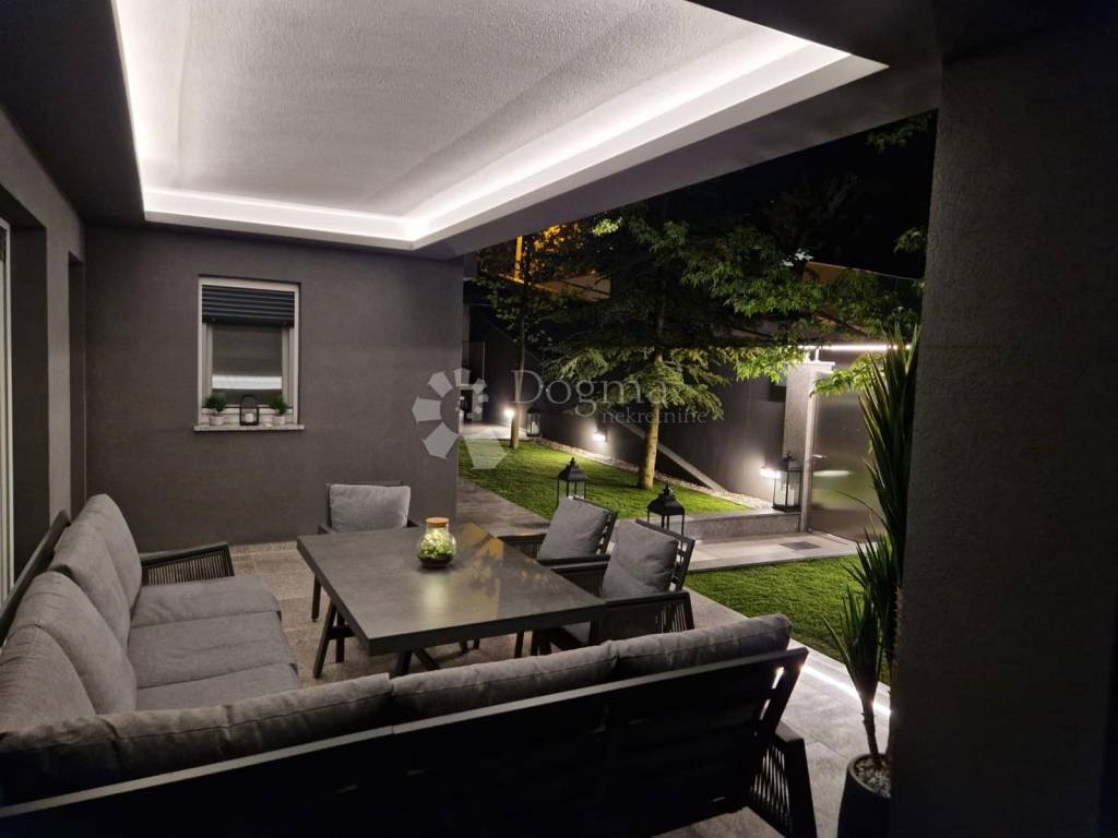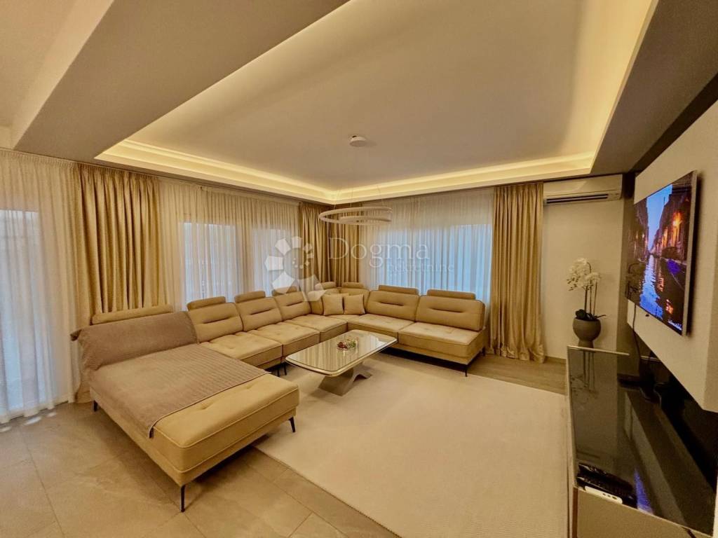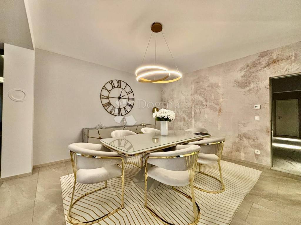 Stan odiše elegancijom i toplinom doma već pri samom ulasku. Interijer je uređen s naglaskom na kvalitetu, funkcionalnost i suvremeni dizajn, pri čemu je svaki detalj pažljivo promišljen. Prostrani dnevni boravak povezan je s blagovaonicom i kuhinjom u otvorenom konceptu koji osigurava obilje prirodnog svjetla i osjećaj prozračnosti. Velike staklene stijene otvaraju prostor prema raskošnoj terasi okruženoj zelenilom, stvarajući savršenu privatnu oazu za jutarnju kavu, opuštanje ili druženja na otvorenom.