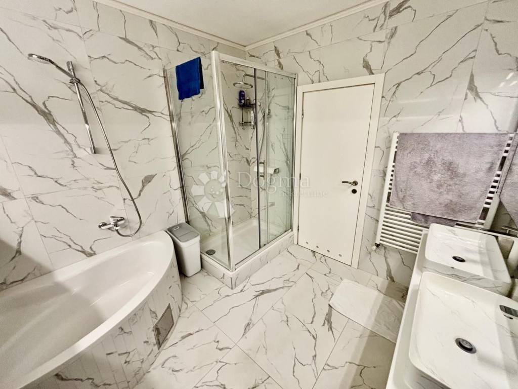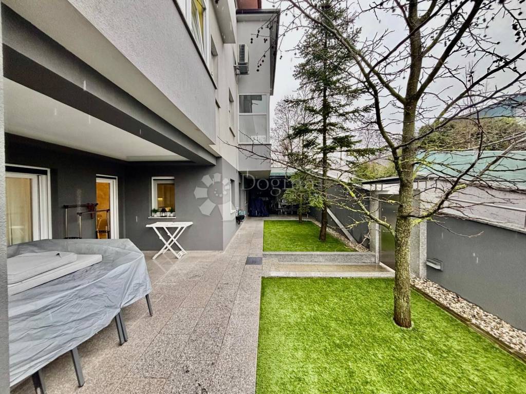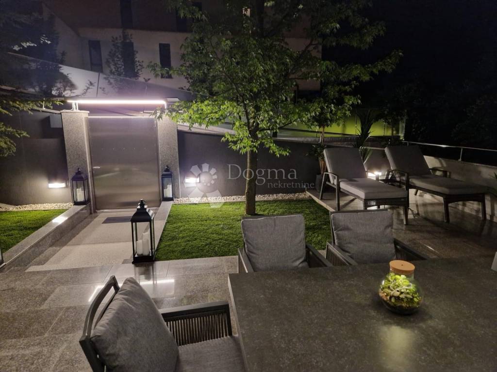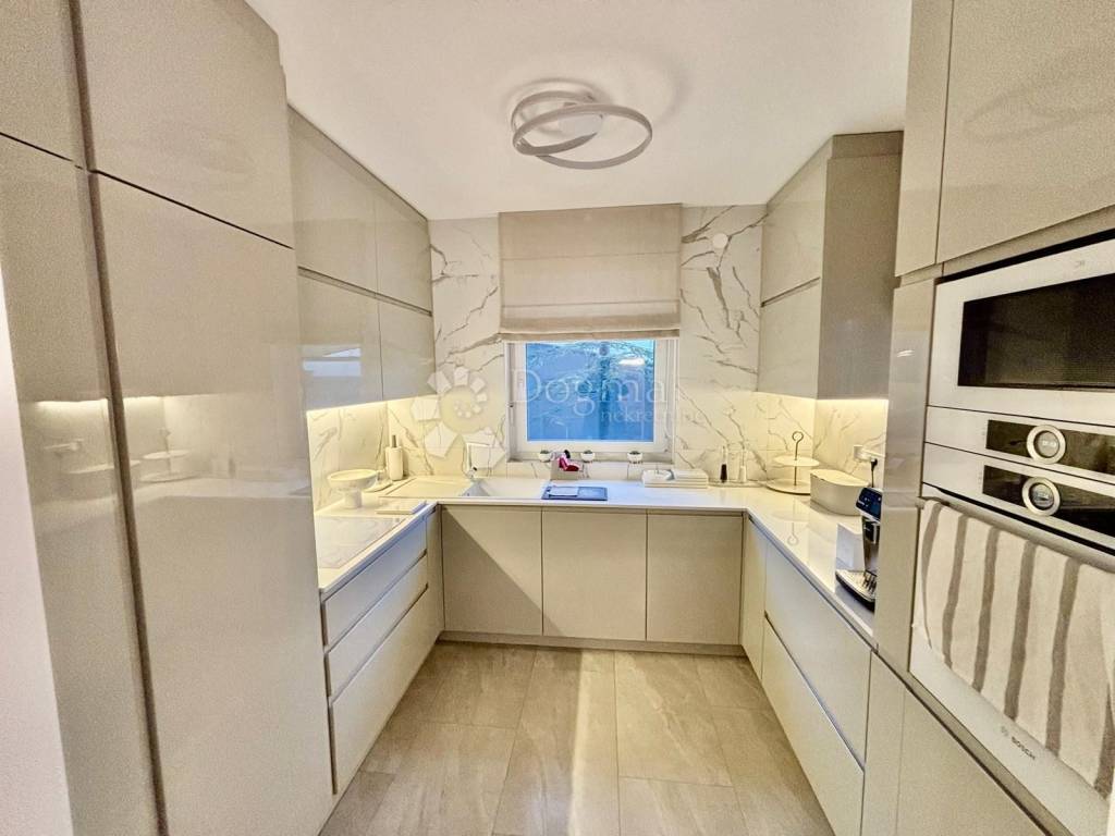 Stan odiše elegancijom i toplinom doma već pri samom ulasku. Interijer je uređen s naglaskom na kvalitetu, funkcionalnost i suvremeni dizajn, pri čemu je svaki detalj pažljivo promišljen. Prostrani dnevni boravak povezan je s blagovaonicom i kuhinjom u otvorenom konceptu koji osigurava obilje prirodnog svjetla i osjećaj prozračnosti. Velike staklene stijene otvaraju prostor prema raskošnoj terasi okruženoj zelenilom, stvarajući savršenu privatnu oazu za jutarnju kavu, opuštanje ili druženja na otvorenom.