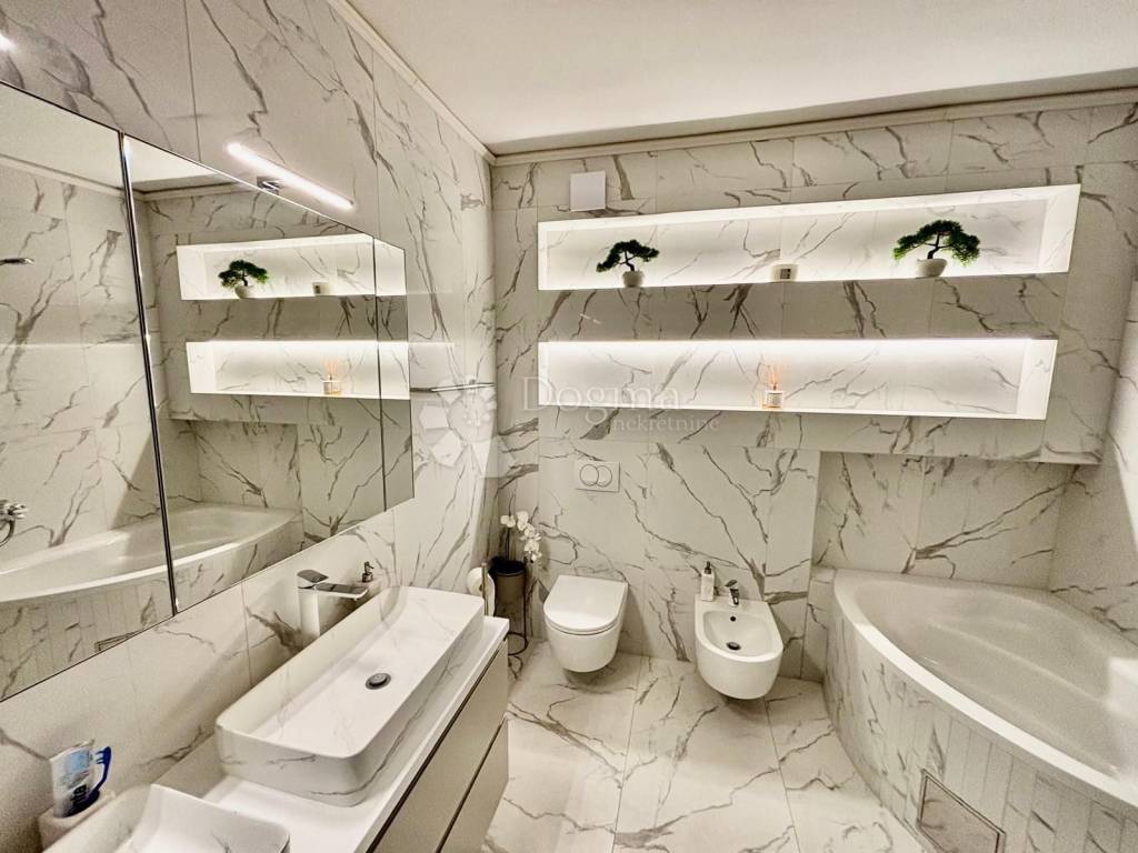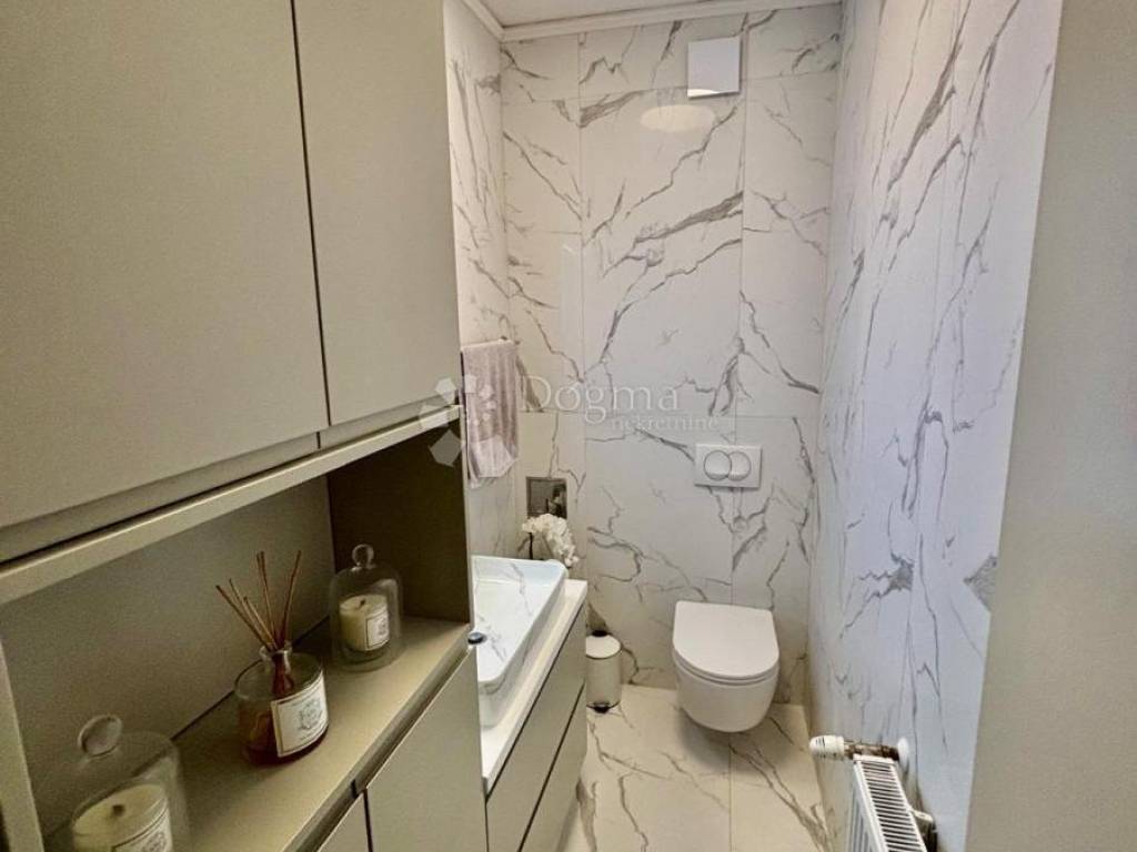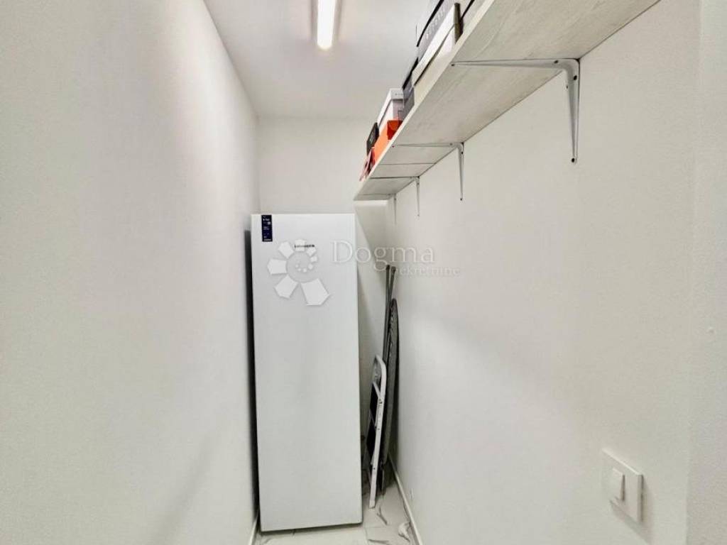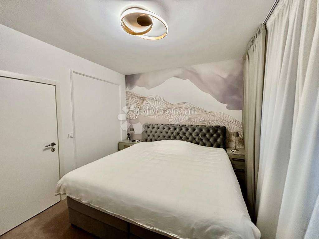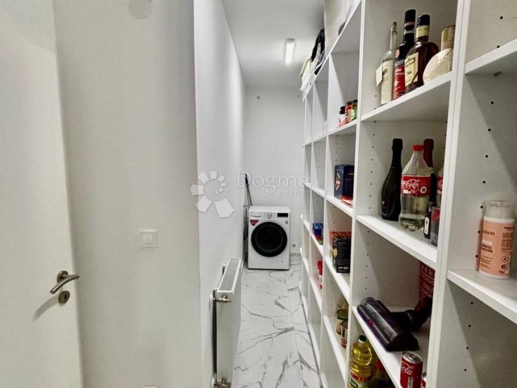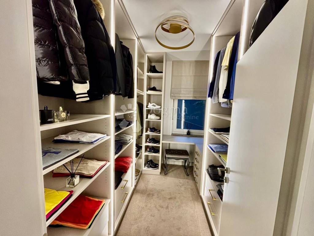 Spavaći dio je odvojen i pruža potpunu privatnost. Glavna spavaća soba zadržava minimalističku eleganciju i prozračnost, dok je veliki, odvojeni garderobni prostor osmišljen kao zasebna cjelina koja nudi iznimno mnogo mjesta za pohranu i organizaciju.Stan raspolaže i prostranom ostavom unutar stambenog prostora, što dodatno povećava funkcionalnost i praktičnost svakodnevnog života.