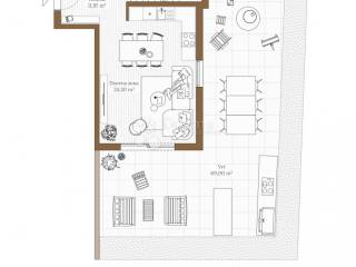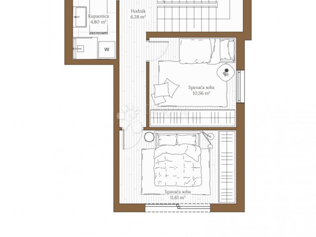 Prostrani dvoetažni stan koji se prostire na etaži prizemlja s dnevnim prostorom i velikim vrtom od 69m2 i na etaži prvog kata od 33,25m2 s dvije spavaće sobe i kupaonicom jugoistočne orijentacije, sveukupno obračunske kvadrature od 96,13m2.