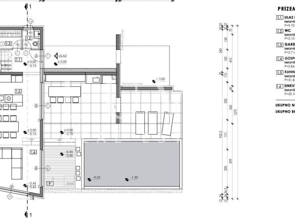 Prizemlje vile nudi otvoren i funkcionalan raspored koji povezuje kuhinju, blagovaonicu i dnevni boravak u prozračnu cjelinu, uz dodatne sadržaje poput garderobe, WC-a i gospodarskog prostora. Velike staklene stijene omogućuju obilje prirodnog svjetla i izravan izlaz na terase i dvorište.