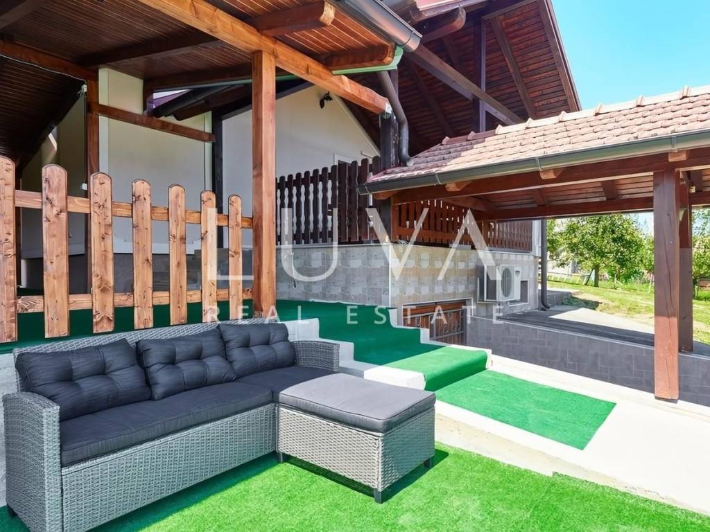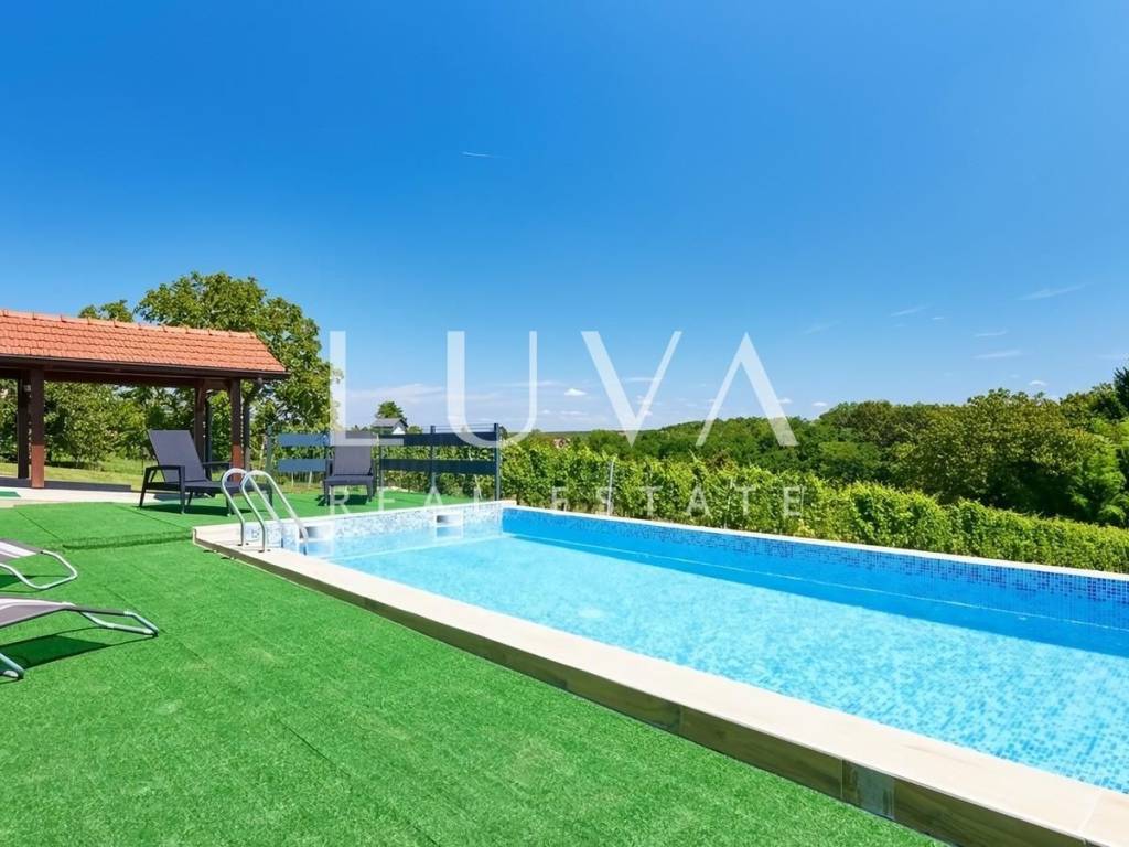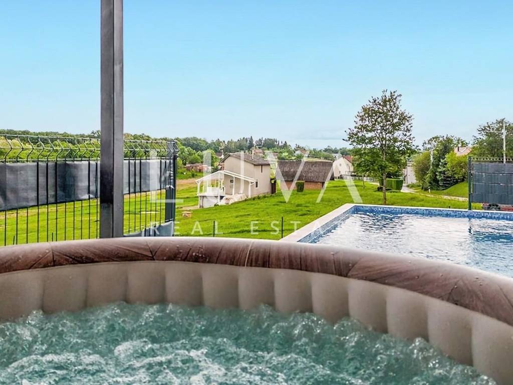 Uz kuću se prostire uređeno i prostrano dvorište s velikom natkrivenom terasom opremljenom roštiljem i jacuzzijem – savršenim prostorom za opuštanje i druženja. Na terasu se nastavlja bazen iz kojeg se pruža pogled na vlastiti vinograd.