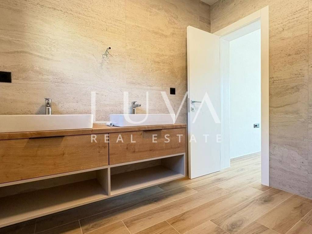 Vila se prostire na prostranoj parceli i nudi ukupno četiri spavaće sobe, svaka s vlastitom kupaonicom, što jamči maksimalnu privatnost i komfor. Tu je i dodatni WC, prostrana dnevna zona s kuhinjom i blagovaonicom, a cijeli objekt opremljen je podnim grijanjem koje osigurava ugodnu atmosferu tijekom cijele godine. Moderni materijali i vrhunski uređaji korišteni u gradnji i uređenju dodatno naglašavaju luksuzni karakter ove nekretnine.