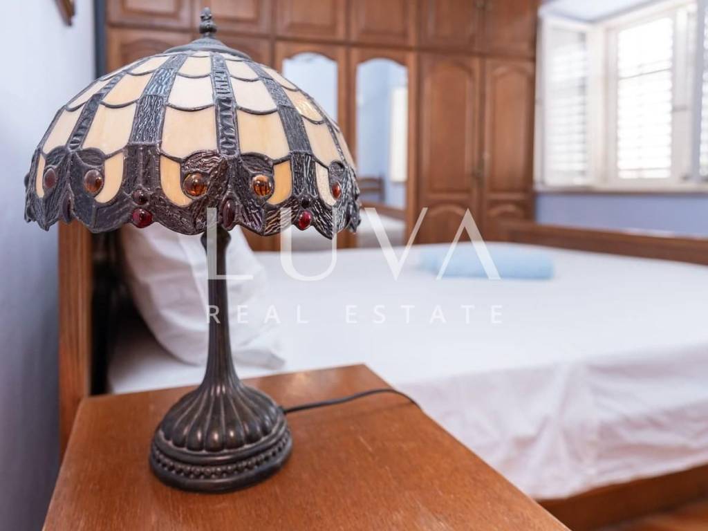 Kuća je organizirana na dvije etaže. U prizemlju se nalazi dnevni boravak povezan s kuhinjom te kupaonica, dok su na gornjoj etaži dvije udobne spavaće sobe i dodatna kupaonica. Prostrana terasa idealno je mjesto za opuštanje ili uživanje u jutarnjoj kavi s nezaboravnim pogledom na povijesne zidine i more.