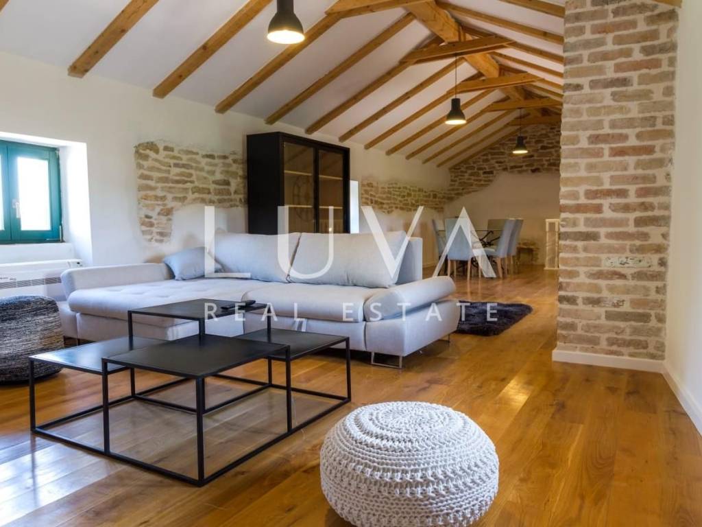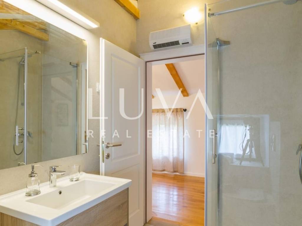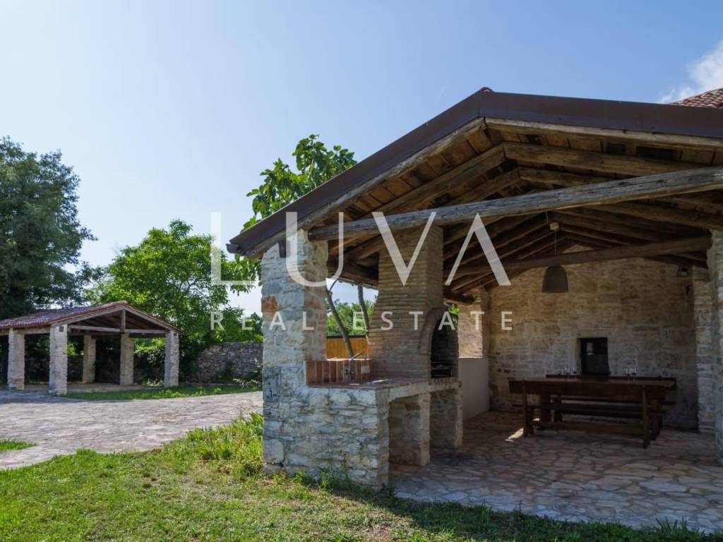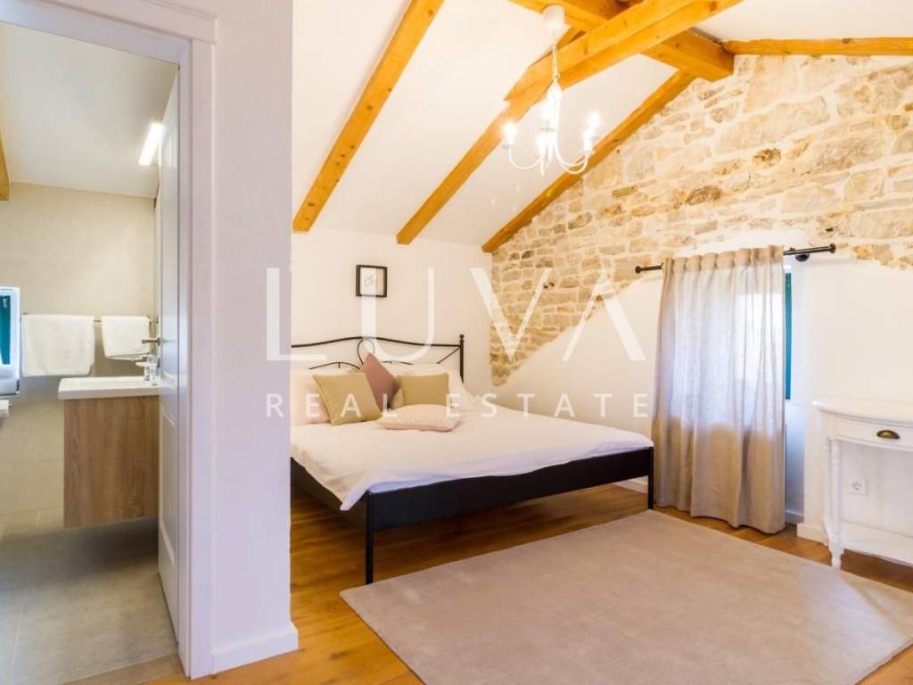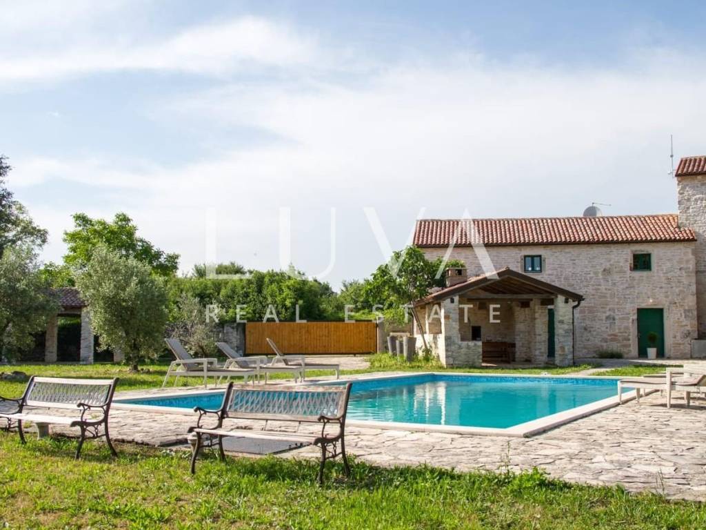 Vanjski prostor jednako je impresivan: veliki bazen površine čak 74 m² sa sunčalištem, natkrivena terasa s roštiljem, sauna za opuštanje te vrt bogat maslinama i mediteranskim biljem. Pomoćna kućica od 30 m² omogućuje dodatni sadržaj – od ljetne kuhinje do ateljea ili spremišta. Uz to, tu su natkrivena i otvorena parkirna mjesta za ukupno šest vozila.