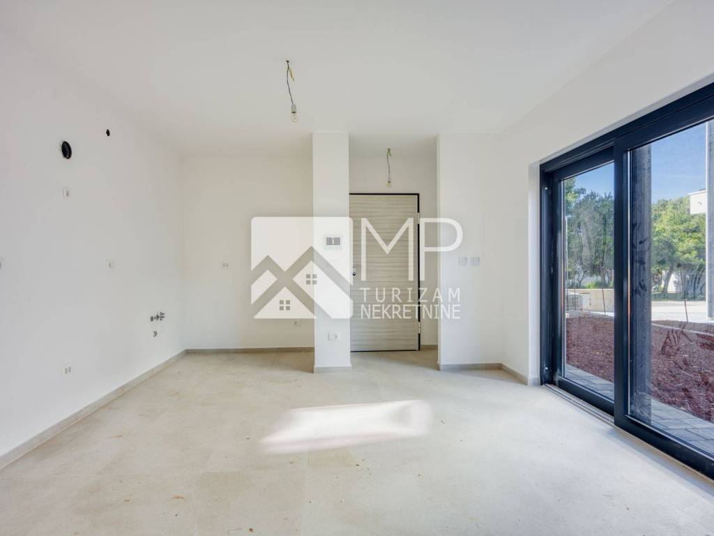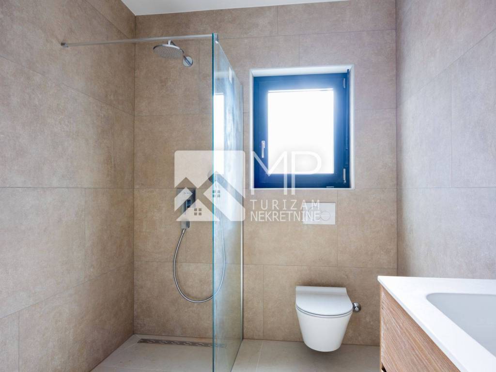 OPREMA : svi stanovi opremljeni su visokokvalitetnom dvoslojnom PVC stolarijom u antracit boji s roletama na struju u DB-u ( staklene stijene su podizno-klizne bez praga ), te komarnicima na svim prozorima. Grijanje i hlađenje osigurano je putem klima uređaja u dnevnom boravku i spavaćim sobama, te je predviđeno električno podno grijanje u svim prostorijama, izuzev spavaćih soba. Sanitarije i keramika velikog profila su najviše kvalitete, koje će zračiti elegancijom, dok je u spavaćim sobama laminat ( u dogovoru sa investitorom, mogućnost odabira po vlastitoj želji ). Zgrada je građena najkvalitetnijim sustavom gradnje, sa vrhunskom zvučnom i toplinskom izolacijom, dok je ulaz u stan osiguran sigurnosnim vratima. Također, imat će priključke za TV i antenu u svakoj sobi. Na terasi je 35 cm parapet i na njega će ići staklena ograda.