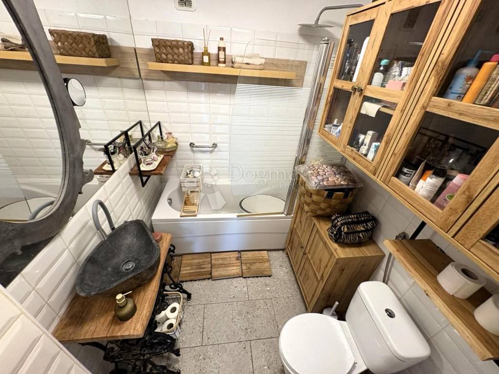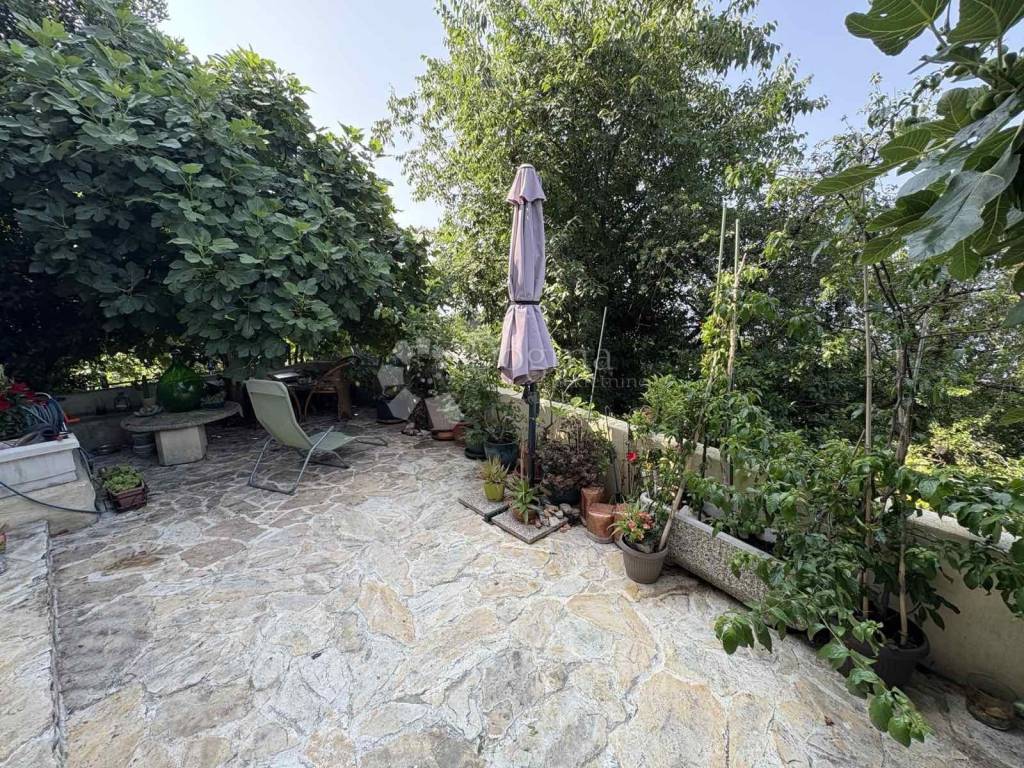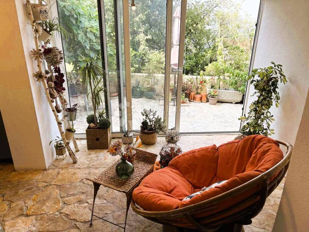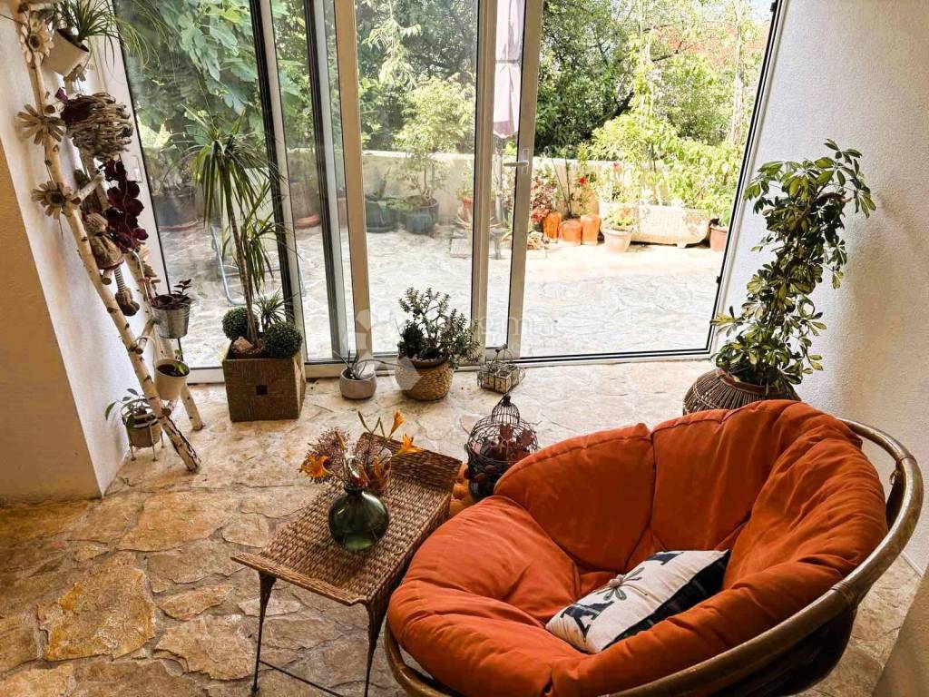 Stan ima dva ulaza klasični kroz zgradu i privatni pristup stepenicama direktno s terase. Ljeti terasa ima potpunu privatnost zbog zelenila, zimi je zaklonjena od elemenata i ugodna za boravak.
