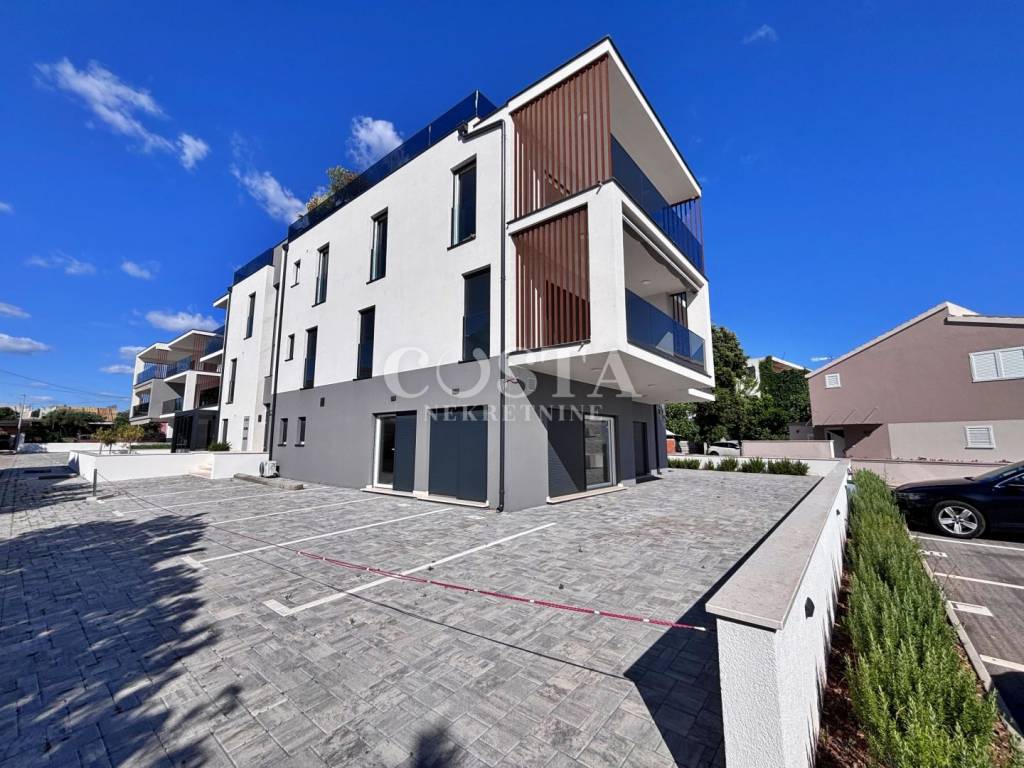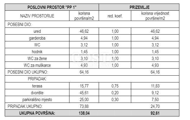 Prodaje se poslovni prostor u novogradnji u mjestu Vodice pokraj Šibenika. Prostor površine 64,16 m2 nalazi se u prizemlju manje poslovno-stambene zgrade s osam jedinica. Sastoji se od jedne prostrane uredske prostorije, garderobe, hodnika i tri sanitarna čvora. Prostor je kompletno klimatiziran, postavljena je kvalitetna stolarija s elektroroletnama i velikim staklenim stijenama, a za podne obloge keramičke pločice. Prostoru pripada i dvorište s terasom i vrtom ukupne površine 60 m2, te dva vanjska parkirna mjesta.Ukupna korisna površina iznosi 138,04 m2 (K.V. 92,61 m2).