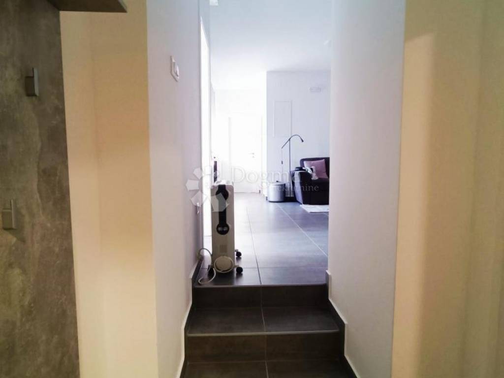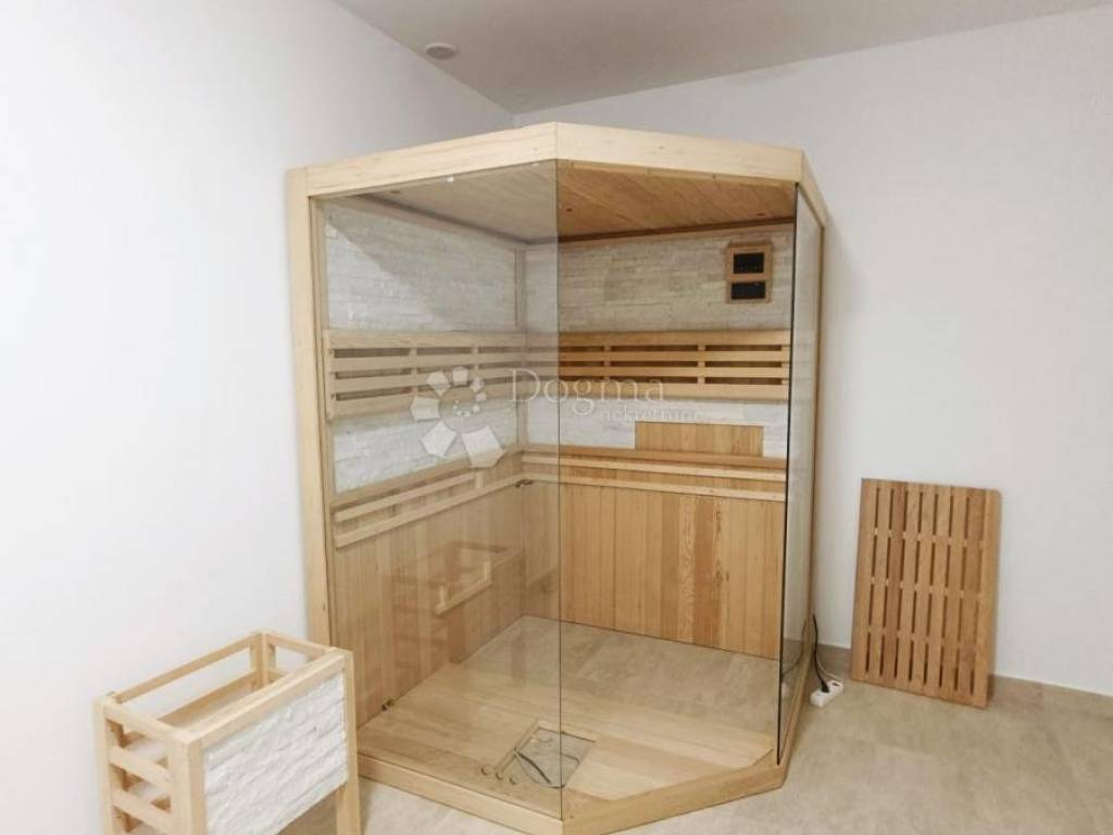 Objekt je izgrađen na parceli od 589 m2. Ukupna površina kuće je 240 m2 i sastoji se od garaže i manjeg dvosobnog stana s 2 kupaonice, fitness prostorom na prizemnoj etaži dok je na katu stan veličine 110 m2 koji se sastoji od 3 spavaće sobe, kupaonice, wc-a i dnevnog prostora s kuhinjom iz kojeg se izlazi na terasu i bazen.