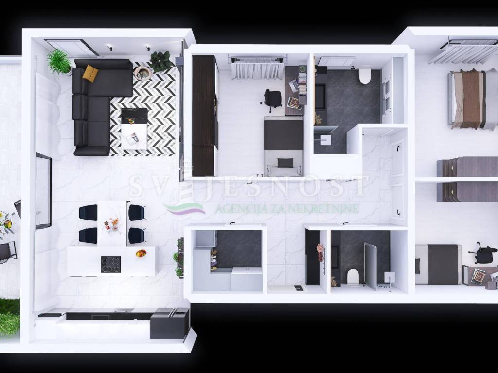 Sastoji se od tri prostrane spavaće sobe od kojih je jedna master room sa pripadajućom kupaonom, hodnika, dnevnog boravka otvorenog tipa zajedno sa kuhinjom i blagavaonom, spremišta (vešeraja).