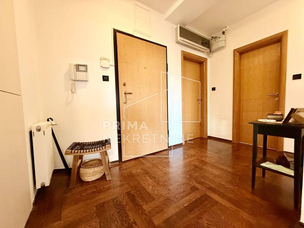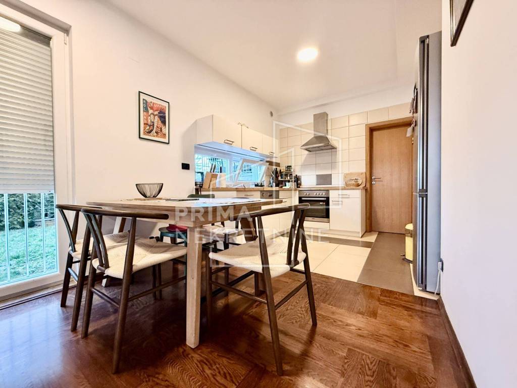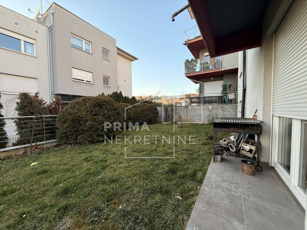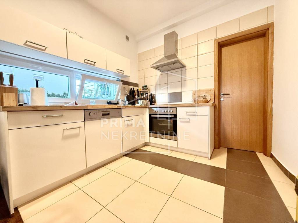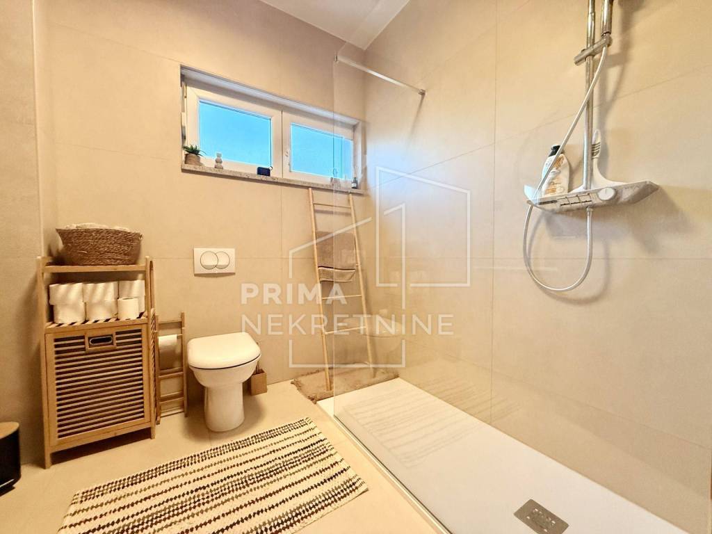 Sastoji se od dvije udobne spavaće sobe površine 11,5 m2 i 12 m2, glavne kupaonice s WC-om površine 5 m2, dodatnog gostinjskog toaleta površine 2 m2 te hodnika površine 4,3 m2 koji povezuje sve prostorije u funkcionalnu i preglednu cjelinu. U središtu stana nalazi se prostrani dnevni boravak s blagovaonicom površine 28,5 m2, povezan s kuhinjom površine 8,3 m2 i zasebnom kuhinjskom ostavom od 3,09 m2, što osigurava visoku razinu funkcionalnosti i ugodnu atmosferu za svakodnevni život i druženja. Iz dnevnog prostora izlazi se na prostranu terasu površine 16 m2, orijentiranu na jug i zapad, koja s privatnim vrtom površine 140 m2 pruža izniman osjećaj privatnosti i boravka na otvorenom.