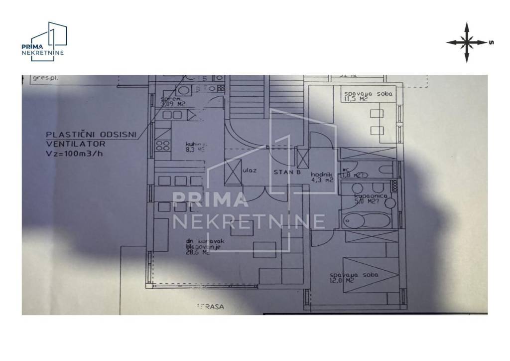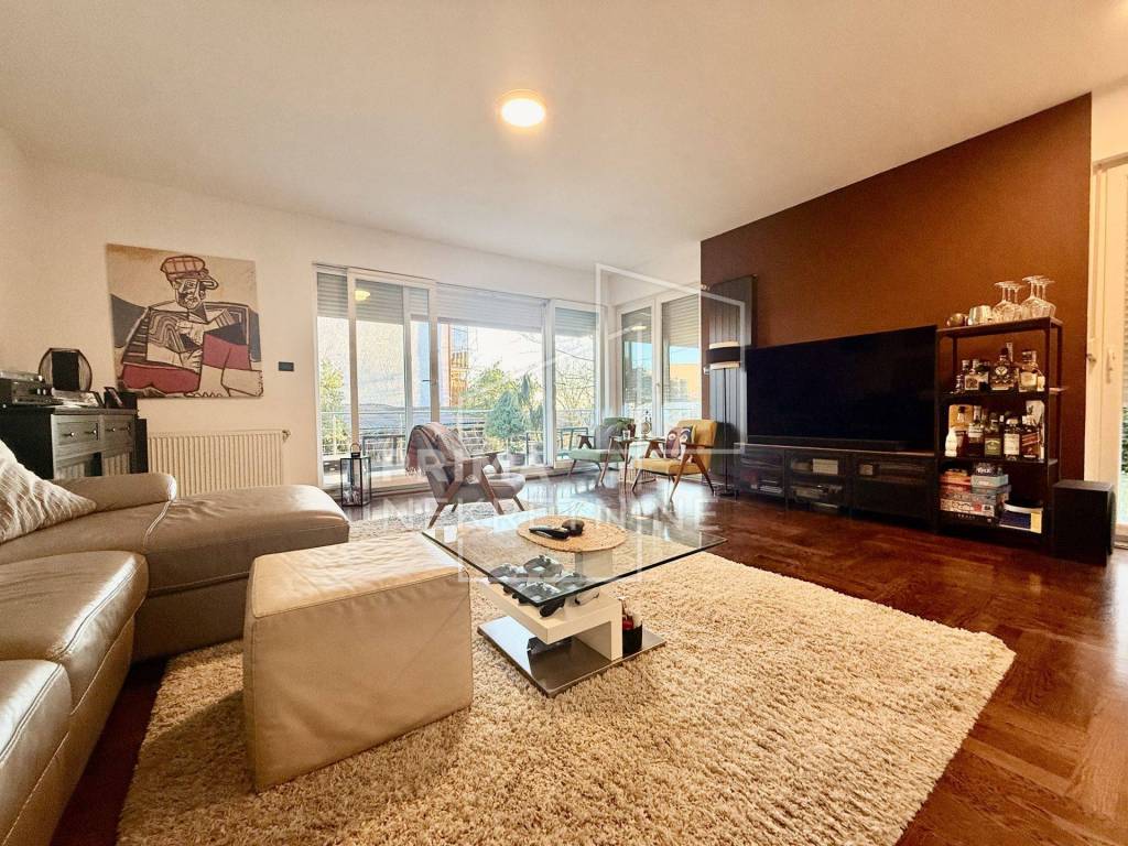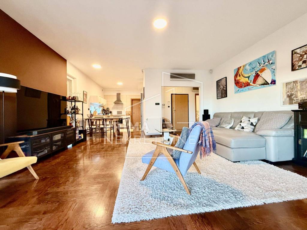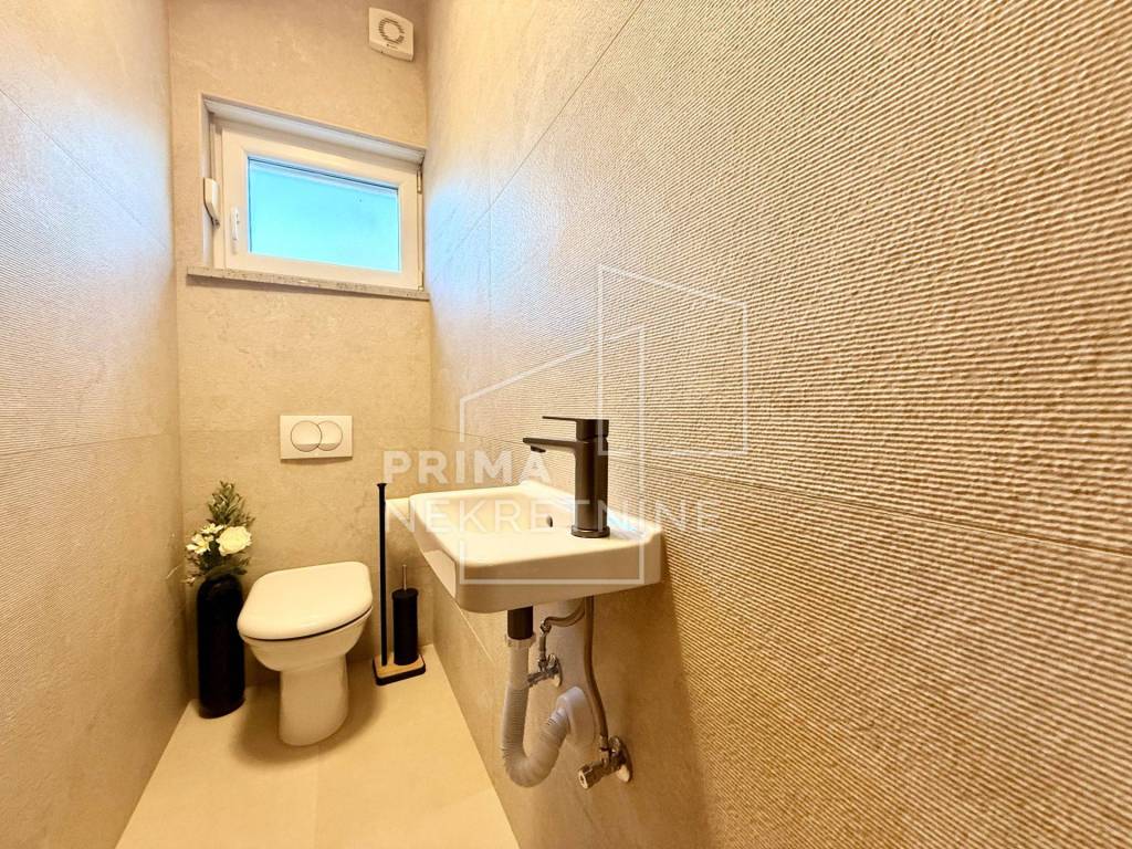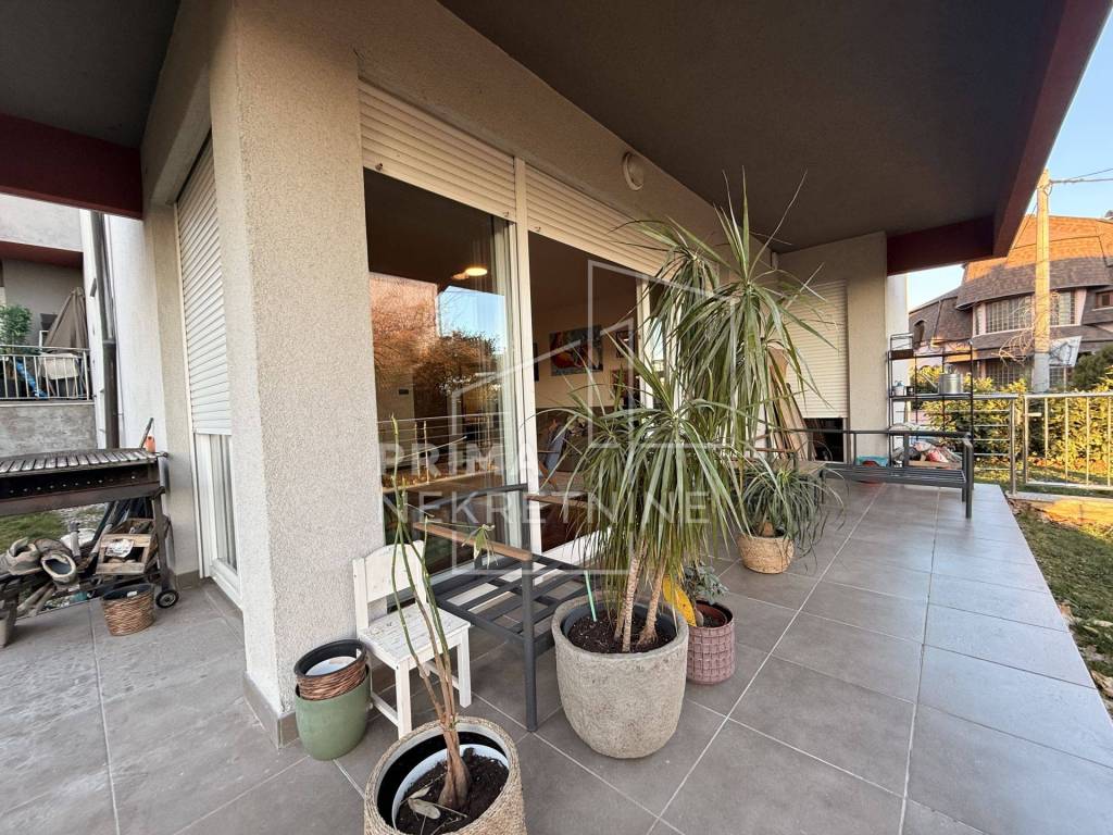 Sastoji se od dvije udobne spavaće sobe površine 11,5 m2 i 12 m2, glavne kupaonice s WC-om površine 5 m2, dodatnog gostinjskog toaleta površine 2 m2 te hodnika površine 4,3 m2 koji povezuje sve prostorije u funkcionalnu i preglednu cjelinu. U središtu stana nalazi se prostrani dnevni boravak s blagovaonicom površine 28,5 m2, povezan s kuhinjom površine 8,3 m2 i zasebnom kuhinjskom ostavom od 3,09 m2, što osigurava visoku razinu funkcionalnosti i ugodnu atmosferu za svakodnevni život i druženja. Iz dnevnog prostora izlazi se na prostranu terasu površine 16 m2, orijentiranu na jug i zapad, koja s privatnim vrtom površine 140 m2 pruža izniman osjećaj privatnosti i boravka na otvorenom.