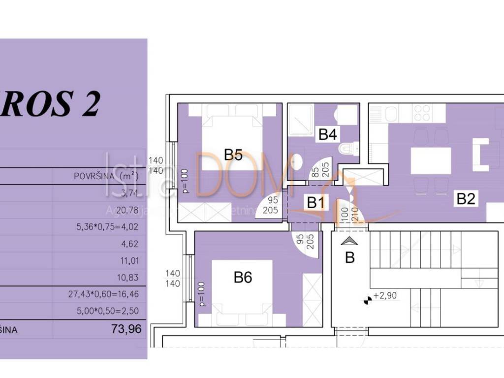 smješten je na prvom katu zgrade E, te ima ukupnu neto površinu od 73.96m², koja uključuje stambeni prostor, lođu, garažno parkirno mjesto i spremište. Stan se sastoji od otvorenog dnevnog prostora s kuhinjom i blagovaonicom, dvije spavaće sobe, kupaonice i hodnika te unutarnjeg spremišta. Lođa pruža ugodan vanjski prostor idealan za odmor i boravak na otvorenom. Uz stan dolaze garažno parkirno mjesto te spremište u prizemlju zgrade.
