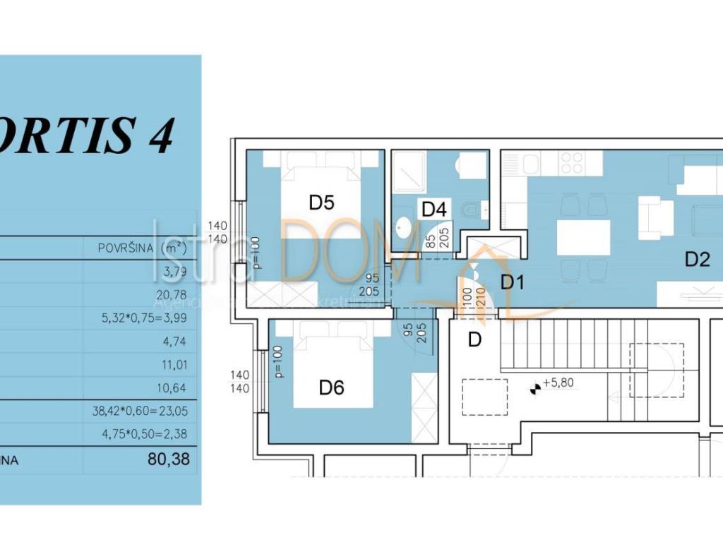 smješten je na drugom katu zgrade F, te ima ukupnu neto površinu od 80.38m², koja uključuje stambeni prostor, lođu, garažno parkirno mjesto i spremište. Stan se sastoji od otvorenog dnevnog prostora s kuhinjom i blagovaonicom, dvije spavaće sobe, kupaonice i hodnika. Lođa pruža ugodan vanjski prostor idealan za odmor i boravak na otvorenom. Uz stan dolazi garažno parkirno mjesto te spremište u prizemlju zgrade.