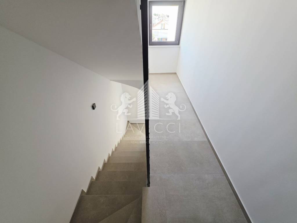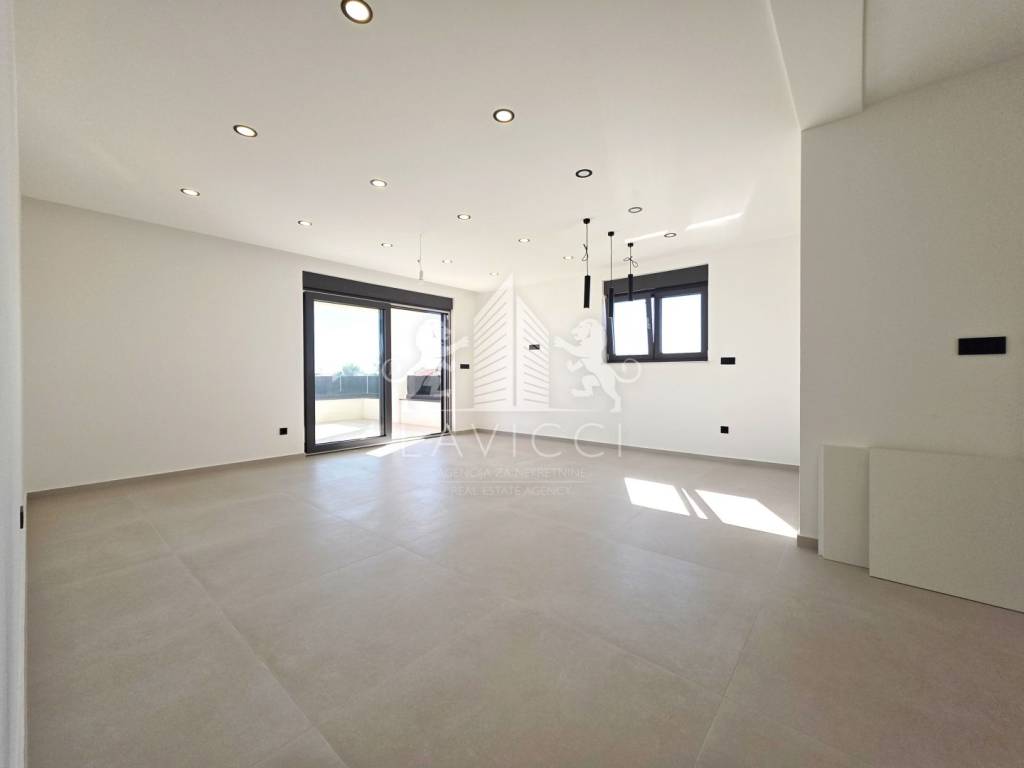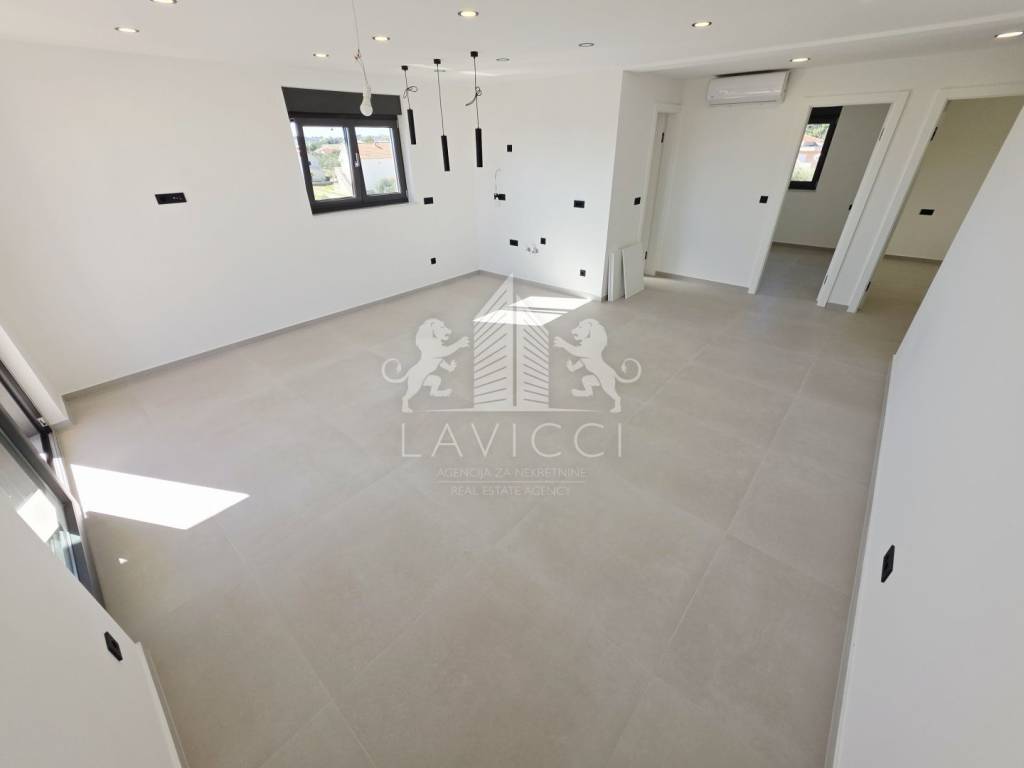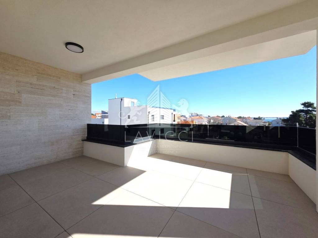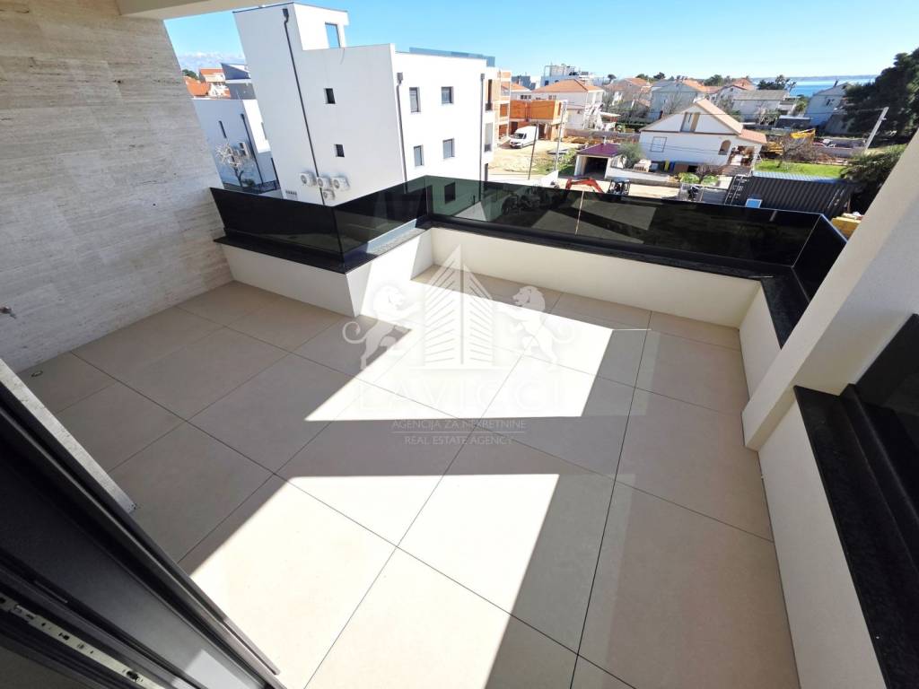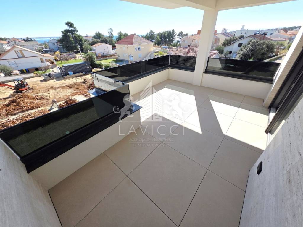 Riječ je o novogradnji na Viru visoke kvalitete, građenoj ciglenim termo blokom uz 10 cm toplinske izolacije fasade, što osigurava energetsku učinkovitost i ugodan boravak tijekom cijele godine, uz očekivani energetski certifikat A. U cijelom apartmanu postavljena je keramika velikog formata 90 × 90 cm, koja dodatno naglašava moderan i luksuzan karakter prostora. Kupaonice su opremljene vrhunskom sanitarijom renomiranih proizvođača Geberit, Grohe i Aquaestil, a kompletni kupaonski namještaj rađen je po mjeri, čime se postiže visoka razina funkcionalnosti i estetike. Stan je dodatno opremljen PVC stolarijom s troslojnim staklom, električnim roletama i komarnicima, klima uređajima u dnevnom boravku i spavaćim sobama te električnim podnim grijanjem u kupaonicama. Protuprovalna i protupožarna ulazna vrata, video portafon te LED rasvjeta u interijeru, na terasama i krovnoj terasi dodatno naglašavaju moderan, siguran i reprezentativan karakter ove nekretnine.