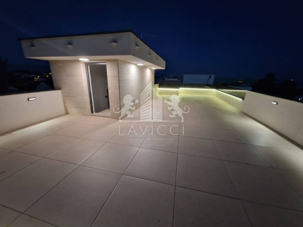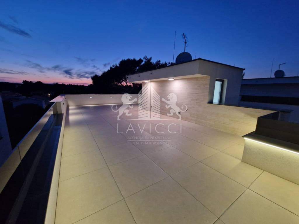 Krovna terasa zamišljena je kao vanjski dnevni prostor i izvedena je s travertino kamenom, koji značajno podiže estetsku vrijednost i dodatno modernizira cijeli objekt, dajući mu luksuzan i suvremen izgled. Na terasi se nalazi natkriveni dio predviđen za ljetnu kuhinju, čime je omogućeno ugodno korištenje prostora tijekom cijelog dana, a izvedene su i instalacije za jacuzzi, što dodatno naglašava ekskluzivni karakter ovog penthouse apartmana na Viru. Velika površina terase omogućuje uređenje zona za sunčanje, druženje i opuštanje uz potpunu privatnost. Apartmanu pripadaju i dva vanjska parkirališna mjesta, što je iznimna prednost za nekretninu u blizini mora i centra.