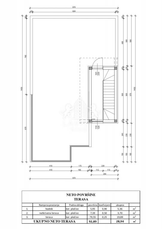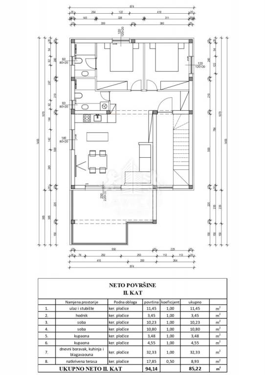 Ukupna tlocrtna površina apartmana iznosi 94,14 m², a funkcionalan raspored prostorija obuhvaća hodnik, dvije spavaće sobe od kojih jedna ima vlastitu kupaonicu, dodatnu kupaonicu, kuhinju s blagovaonicom i dnevnim boravkom te natkrivenu terasu, dok posebnu vrijednost ove nekretnine čini pripadajuća krovna terasa površine 87 m².