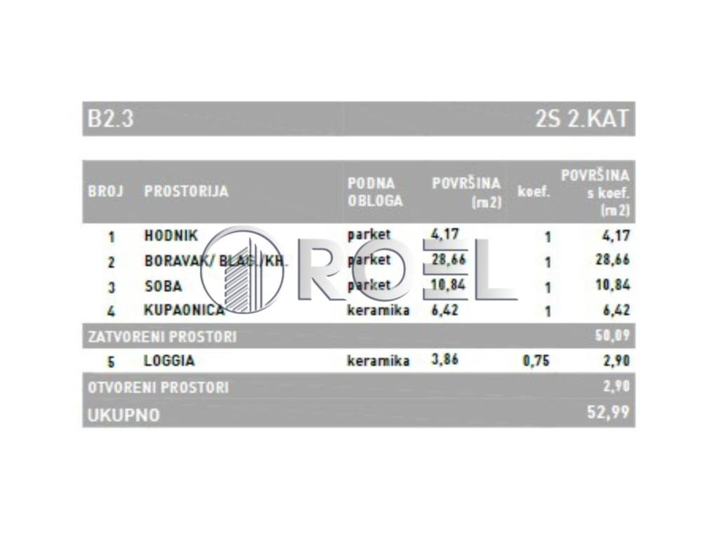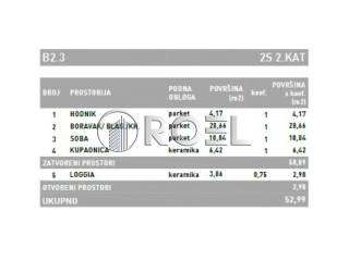 Dvosobni stan ukupne površine 52.99m, smješten u zagrebačkoj četvrti Dubrava. Nalazi se na drugom katu i u prizemlju zgradeod ukupno 6 katova. Sastoji se od ulaznog hodnika, dnevnog boravka s kuhinjom i blagovaonicom, jedne spavaće sobe, kupaonice s WC-om i lođe. Orijentiran na jug.