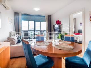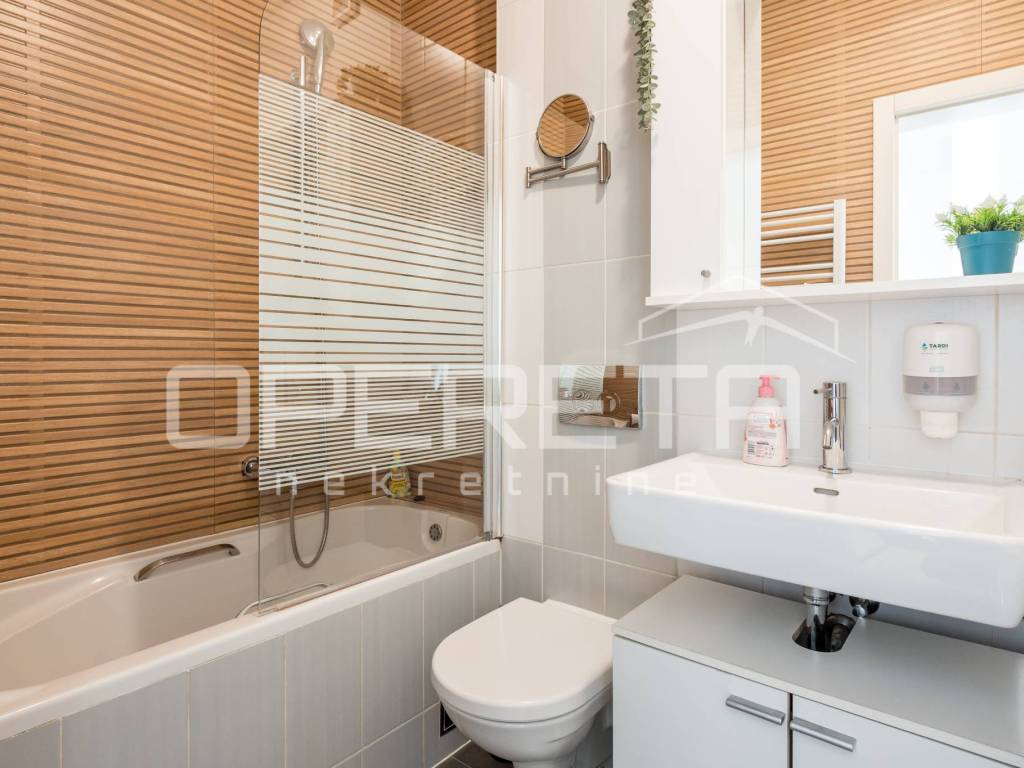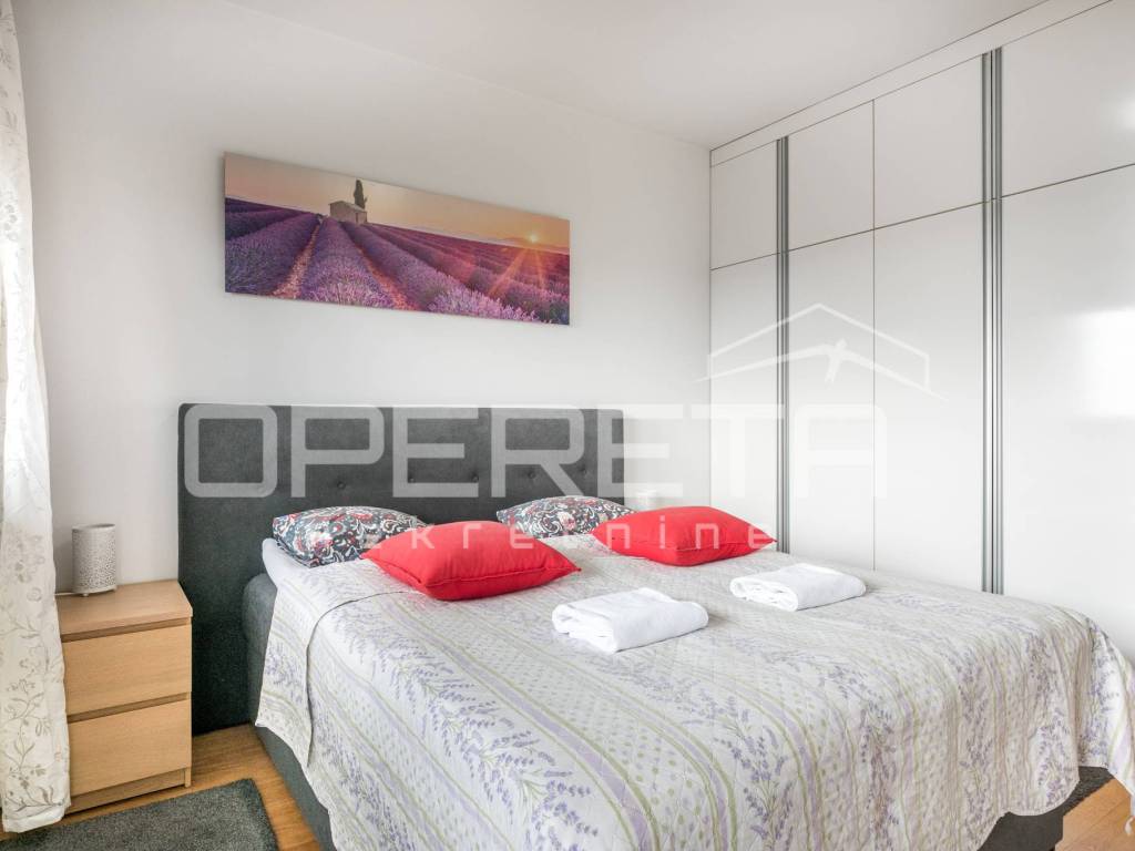 Funkcionalni raspored stana; kupaonica, kuhinja, spavaća soba, dnevni boravak s blagovaonicom i izlazom na loggiu. Potpuno opremljen vrhunskim uređajima i modernim namještajem, idealan za poslovne ljude, samca ili par.