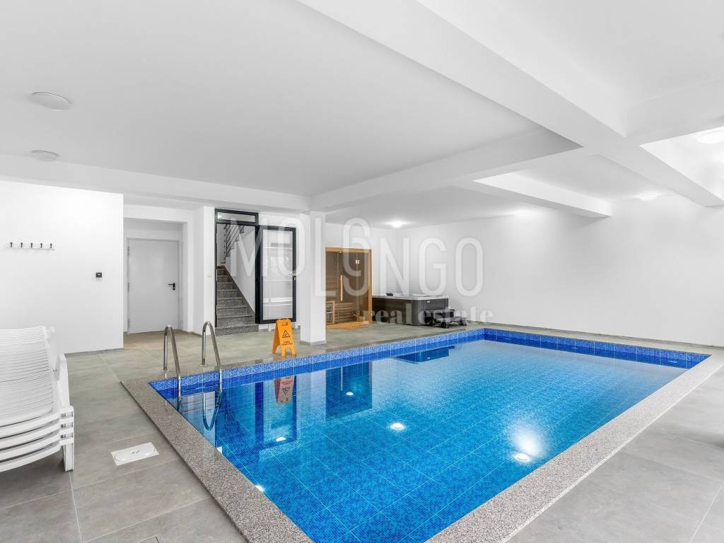 Prizemlje je osmišljeno kao prava privatna wellness oaza – s grijanim bazenom sa slanom vodom, jacuzzijem i saunom, idealno za cjelogodišnje uživanje i opuštanje.