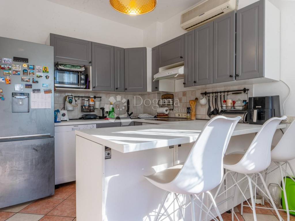 * Ulazni hodnik * Kupaonica * Prostrani open space dnevni boravak s kuhinjom i blagovaonicom * Izlaz na ograđenu okućnicu s pogledom na Učku i more