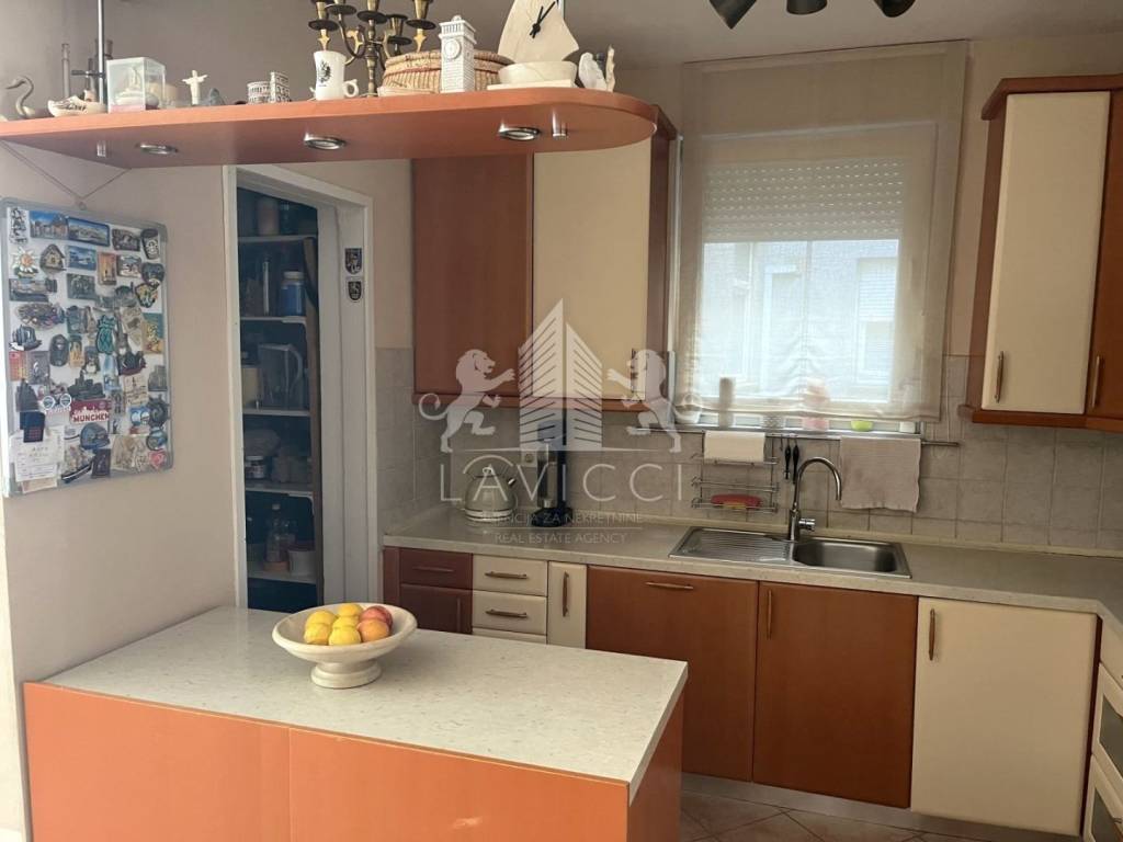 Stan je kompletno namješten, odmah useljiv i i funkcionalno raspoređen. Sastoji se od dnevnog boravka povezanog s kuhinjom i blagovaonicom, tri spavaće sobe, loggie koja pruža dodatni prostor za boravak, kupaonice s toaletom, zasebnog gostinjskog toaleta te izbe koja osigurava dodatni prostor za pohranu.