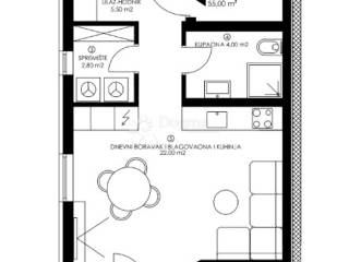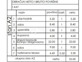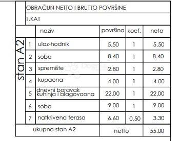 Stan neto površine 55 m funkcionalnog je i odlično iskorištenog rasporeda te se sastoji od dnevnog boravka s kuhinjom i blagovaonicom, dvije spavaće sobe, kupaonice, hodnika te loggie koja pruža dodatni komfor i ugodan vanjski prostor za opuštanje.