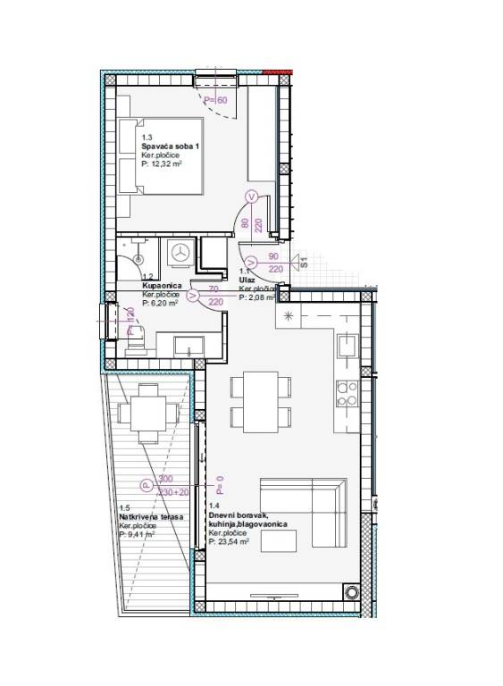 Stan S1 – nalazi se na prvom katu, ima 51,34m2 neto korisne površine, te se sastoji od: ulaz, spavaća soba, kupaonica, kuhinja, blagovaonica i dnevni boravak, natkrivena terasa. 1 parkirno mjesto ispred zgrade. Cijena: 175.000 €