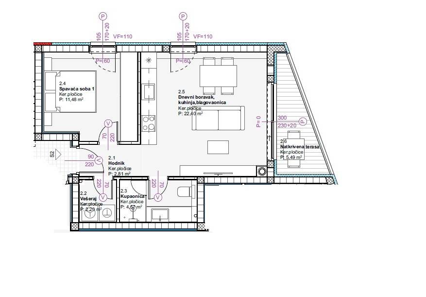 Stan S2 – nalazi se na prvom katu, ima 48,70m2 neto korisne površine, te se sastoji od: hodnik, vešeraj, spavaća soba, kupaonica, kuhinja, blagovaonica i dnevni boravak, natkrivena terasa. 1 parkirno mjesto.Cijena: 165.000 €
