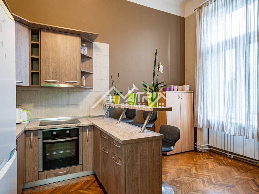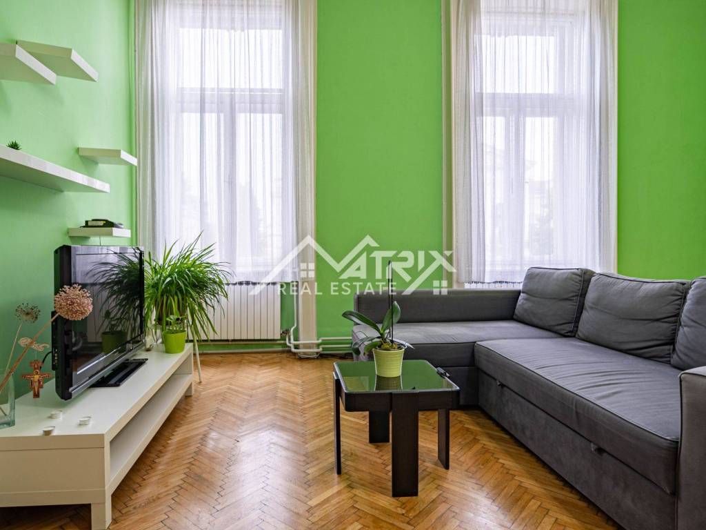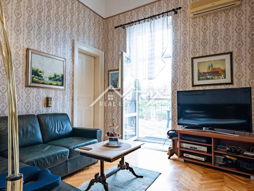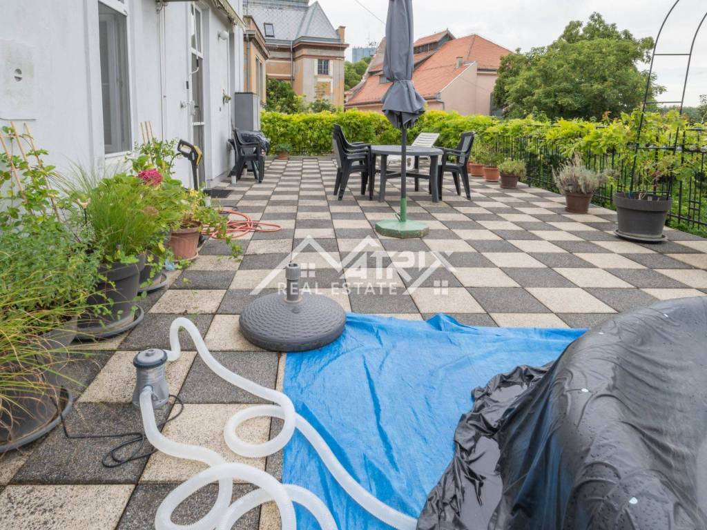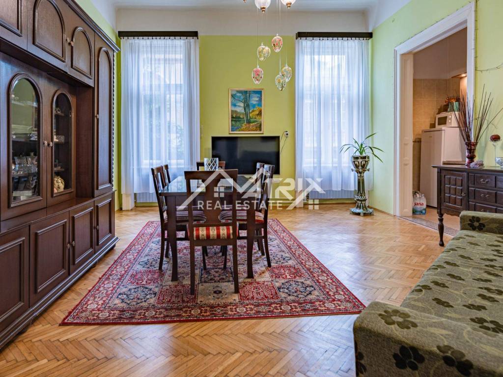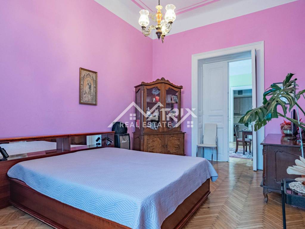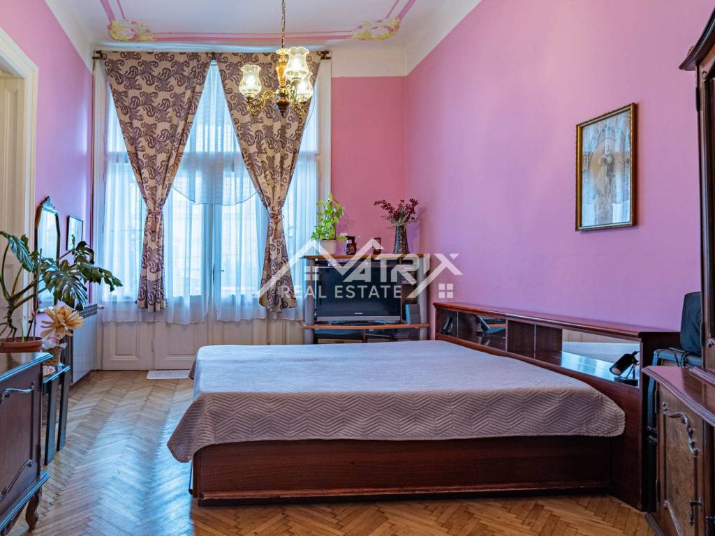 U srcu jedne od najreprezentativnijih ulica grada smjestila se raskošna secesijska zgrada iz ranog 20. stoljeća, zaštićena kao arhitektonska baština i poznata po impozantnom stubištu od kovanog željeza, visokim stropovima i bogatim štukaturama. Na njezinu sunčanu južnu stranu otvara se reprezentativan stan od približno 180 m² interijera koji, uz privatnu terasu od 100 m², stvara rijetku gradsku oazu.