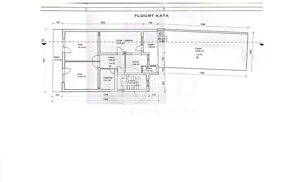 -1. kat: Neto stambena površina 74,18 m² + balkon 10,65 m² + loggia 7,90 m² + terasa 59,95 m²