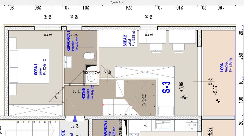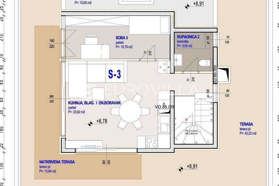 Kaštela Gomilica, komforan trosoban penthouse od 148,6 m2, nalazi se u novogradnji na 2.katu urbane zgrade uz pripadajućom garažom za dva automobila.U naravi dvoetažni stan, na donjoj etaži nalaze se dvije komforan spavaće sobe, jedna kupaonica, komforna lođa povezana s sobom. Na nadgrađu koje je povezano unutarnjim stepenicama je dnevni boravka s kuhinjom i blagovaonicom otvorenog tipa, jedna spavaća soba, kupaonica te velika djelomično natkrivena terasa.Zatvorena stambena površina 80,4 m2, lođa od 7,65 m2 naslonjena na spavaću sobu, te djelomično natkrivene krvne terase od 56 m2, naslonjen je na dnevni boravaka na nadgrađu.Uz stan pripadajuća garaža 15,2 m2 te jedno vanjsko parkirno mjesto 12,5 m2 po cijeni od 35.000 EUR.Ukupna neto obračunska površina iznosi 110,85 m2.Orijentacija stana: jug-istok-zapadPredviđeni završetak radova je 07/2026.g.Kvalitetna gradnja uz izvrsnu toplinsku izolaciju termo fasada, PVC zatvori podizno klizne stijenke s električnim roletama, podovi s keramičke pločice i parket, podno grijanje u kupaonici, kompletno opremljena kupaonice. Sve prostorije u stanu su klimatiziraneZa sve dodatne informacije stojim vam na raspolaganju.... Više na eurovilla.hr, ID: 114269