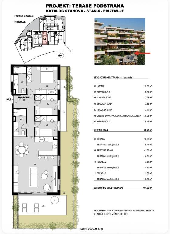 TERASE PODSTRANA | Ekskluzivan projekt novogradnje uz moreSplit - Podstrana | Luksuzna stambeno-poslovna zgrada suvremenog dizajnaProjekt TERASE u Podstrani predstavlja ekskluzivnu novogradnju smještenu na jednoj od najatraktivnijih mikrolokacija . Riječ je o luksuznoj stambeno-poslovnoj zgradi s ukupno 57 stambenih jedinica, projektiranoj i građenoj prema najvišim standardima kvalitete, s posebnim naglaskom na moderan, funkcionalan i suvremen način života. Planirano useljenje predviđeno je u drugoj polovici 2028. godine.STAN S4 - trosoban stan smješten na etaži visokog prizemlja zgrade, zatvorene površine 86, 77 m², kojem dodatnu vrijednost daju natkrivena terase površine 22, 06 m² te prostrani privatni vrt površine 41, 55 m². Funkcionalan raspored prostora obuhvaća ulazni hodnik, tri spavaće sobe od kojih jedna s pripadajućom kupaonicom, zajendičku kupaonicu te dnevni boravak s blagovaonicom i kuhinjom otvorenog tlocrta s izlazom na terasu i vrt koji okružuje stan.U cijenu stana uključena su dva garažna parkirna mjesta ukupne površine 30 m² te spremište površine 4 m², dok ukupna obračunska površina stana iznosi 118, 54 m². Stan će biti opremljen vrhunskom opremom koja uključuje dizalicu topline, podno grijanje cijelog stana, klimatizaciju u svim prostorijama, ALU stolariju, protuprovalna ulazna vrata, parket prve klase te visokokvalitetnu keramiku i sanitarnu opremu.Nekretnina se nalazi svega 200 metara od mora, neposredno iznad hotela Le Méridien Lav, u blizini svih potrebnih sadržaja, što ovu lokaciju čini idealnim izborom za ugodan i kvalitetan život ili investiciju.Za sve dodatne informacije stojimo na raspolaganju.... Više na eurovilla.hr, ID: 142469