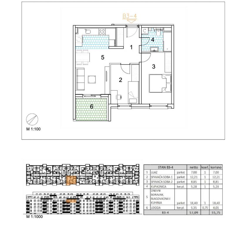 Trosoban stan površine 55,75 m2 smješten na 3. katu.Stan B3-4 sastoji se od ulaza, 2 spavaće sobe, kupaonice, dnevnog boravka, kuhinje s blagovaonicom te loggije.Velika Gorica, projekt stambene novogradnje namijenjen stalnom stanovanju, koji obuhvaća 91 stambenu jedinicu. U sklopu zgrade osigurano je ukupno 182 garažnih i parkirnih mjesta, od čega je 28 garažnih mjesta smješteno u prizemlju, 97 garažnih i parkirnih mjesta u podzemnoj etaži te dodatnih 57 parkirnih mjesta na razini terena.Uz kupnju stana obavezna je kupnja garažnog mjesta na -1 etaži po cijeni od 25.000,00 EUR ili garažnog mjesta na 0 etaži po cijeni od 30.000,00 EUR zajedno s parkirnim garažnim mjestom po cijeni od 18.000,00 EUR ili vanjskim parkirnim mjestom po cijeni od 10.000,00 EUR. Dakle, garažno mjesto na -1 etaži ili garažno mjesto na 0 etaži + garažno parkirno mjesto ili vanjsko parkirno mjesto.Građevina je projektirana kao armiranobetonska konstrukcija, međusobno povezana zidovima i gredama, s punim armiranobetonskim stropnim pločama i ravnim krovom. Vertikalni konstruktivni sustav čine armiranobetonski zidovi debljine 20 cm izvedeni kroz sve etaže, dok horizontalni sustav čine armiranobetonske ploče debljine 20 cm.Pročelje je predviđeno s toplinskom izolacijom debljine 15 cm u ETICS sustavu, izvedenom od EPS-a, a u zonama požarnih prekida, u kontaktu sa stubištem i na podgledu prizemlja od mineralne vune iste debljine. Završna obrada izvodi se armiranom mrežicom, gletanjem i završnim slojem u boji i teksturi prema projektu. Vanjska stolarija predviđena je kao PVC, u tonu definiranom projektom.Krov je projektiran kao ravni neprohodni krov, a svi slojevi izvedeni su u skladu s projektom fizike zgrade. Unutarnji pregradni zidovi izvode se kao gipskartonski, debljine 10 do 20 cm, ovisno o namjeni prostora, uz primjenu potrebne zvučne izolacije gdje je to predviđeno. Zidne površine su završno obrađene soboslikarskim radovima u boji prema projektu.Podovi u stanovima izvode se kao plivajući sustav s toplinskom izolacijom od polistirena i cementnim estrihom. Završne podne obloge predviđene su prema namjeni prostora: keramika u sanitarijama, kuhinjama i na vanjskim površinama, a troslojni hrastov parket u dnevnim boravcima, blagovaonicama, ulaznim prostorima i spavaćim sobama. U ponudi su tri varijante keramičkih pločica.Grijanje je riješeno plinskim etažnim podnim sustavom. Stanovi su opremljeni klima uređajima marke Bosch, PVC stolarijom s električnim roletama, troslojnim hrastovim parketom te sobnim vratima proizvođača RV Križevci. Ulazna vrata u stanove su protuprovalna, proizvođača Kolnoa sa sustavom zaključavanja Multilock.Useljenje 05/27Za sva pitanja Vam stojimo na raspolaganju.... Više na eurovilla.hr, ID: 175261