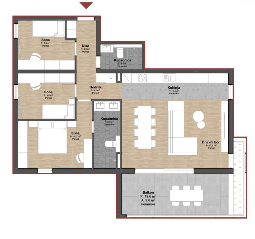 Split - Podstrana | Stambena zgrada s devet modernih stambenih jedinica - drugi red od mora.Na prodaju je atraktivna stambena zgrada s ukupno devet stambenih jedinica, smještena na iznimno poželjnoj lokaciji u drugom redu od mora u Podstrani.Projekt je osmišljen i bit će izveden prema najvišim građevinskim standardima, uz pažljivo birane materijale i suvremena tehnička rješenja koja osiguravaju udobnost, sigurnost i visoku kvalitetu stanovanja.Iznimna lokacija omogućuje da svaki stan i svaka etaža uživaju u otvorenom i trajno nesmetanom pogledu na more.B - S6 | Trosoban stan na drugom katuStan se sastoji od ulaznog hodnika, tri spavaće sobe ( od kojih jedna s pripadajućom kupaonicom ), zajedničke kupaonice, kuhinje s blagovaonicom i dnevnog boravka. Stambena površina iznosi 90, 13 m².Dnevni boravak ima izlaz na natkriveni balkon površine 19, 64 m².Ukupna neto površina stana s garažnim mjestima iznosi 113, 95 m².U cijenu su uključena dva garažna parkirna mjesta.Mikrolokacija je iznimna - svega nekoliko koraka do mora, uređenih plaža i nove šetnice koja povezuje cijelu Podstranu, kao i blizina svih potrebnih sadržaja (javni prijevoz, trgovine, restorani, kafići i dr.).Za sve dodatne informacije stojimo Vam na raspolaganju.... Više na eurovilla.hr, ID: 325932